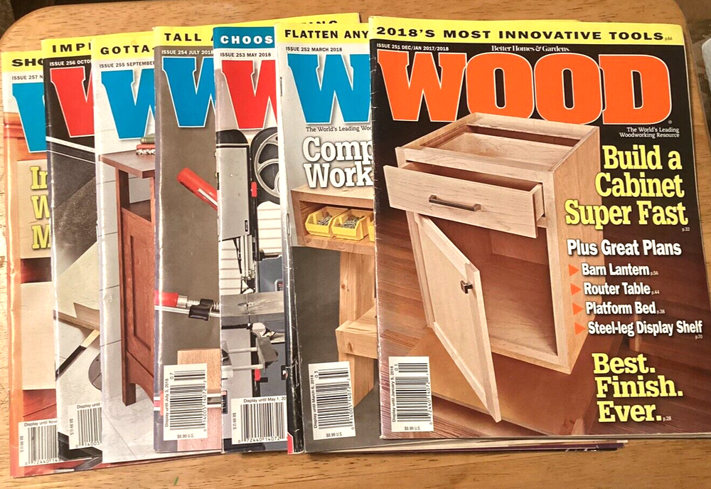 Better Homes and Garden Wood Magazine. Lot of 7 magazines from 2018. Months included are: Dec 2017/Jan 2018 March May July Sept Oct Nov