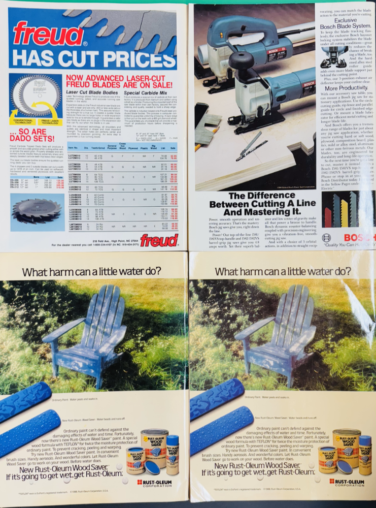 Better Homes and Gardens Wood Magazine Issue No. 22, 23, 24 & 25 (April, June, August & October ~ 1988) Step into the golden era of woodworking with this rare and highly collectible issue of "Better Homes and Gardens Wood Magazine". Published in 1988, this magazine is a treasure trove for woodworking enthusiasts and collectors alike. Highlights and Features: April 1988 (Issue No. 22): Dive into onlay techniques for furniture and accessories, creating parquet-like designs that elevate your craftsmanship. This edition also explores brushed lacquer finishes , adding a professional touch to your projects. June 1988 (Issue No. 23) : Discover step-by-step plans for building elegant cabinets and learn about tool maintenance tips to keep your workshop running smoothly. This issue is packed with practical advice for woodworkers of all levels. August 1988 (Issue No. 24) : Transform your outdoor spaces with DIY patio furniture plans that combine style and durability. Plus, explore wood carving techniques to add intricate details to your creations. October 1988 (Issue No. 25): Prepare for the holiday season with festive woodworking projects , including handcrafted gifts and decorations. This edition also features advanced veneering techniques to refine your skills. - Quality and Condition: These issues have been preserved in exceptional condition, showing minimal signs of wear. Thier pages remain crisp and vibrant, ready to inspire your next woodworking masterpiece. - Age and Collectability: With nearly four decades of history, these magazines are not just a resource but a piece of woodworking heritage. Thier vintage charm makes them a must-have for collectors. Don't miss the chance to own this slice of woodworking history. Whether you're a seasoned craftsman or a passionate collector, these magazines are a testament to the enduring art of woodworking. Act now to add these gems to your collection! Wood was founded in 1984 on the principle of the Better Homes and Gardens Test Kitchen, where no recipe goes into the magazine before it's tested. For woodworkers, that means that every project in the magazine has been built in Wood's own woodworking shop; every woodworking technique published has been tried and accomplished by the editors; and every tool or product that appears in the pages of the magazine has been shop-tested and its performance evaluated.