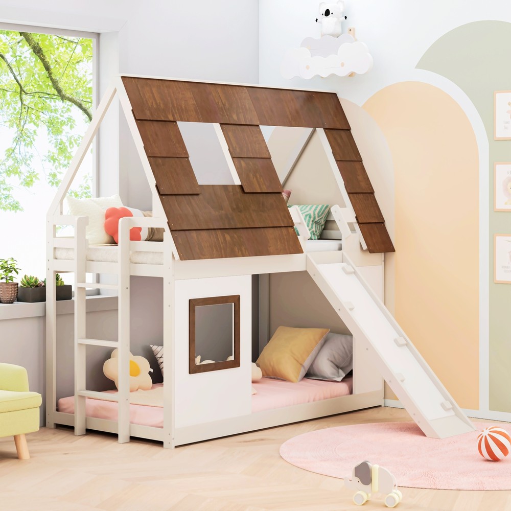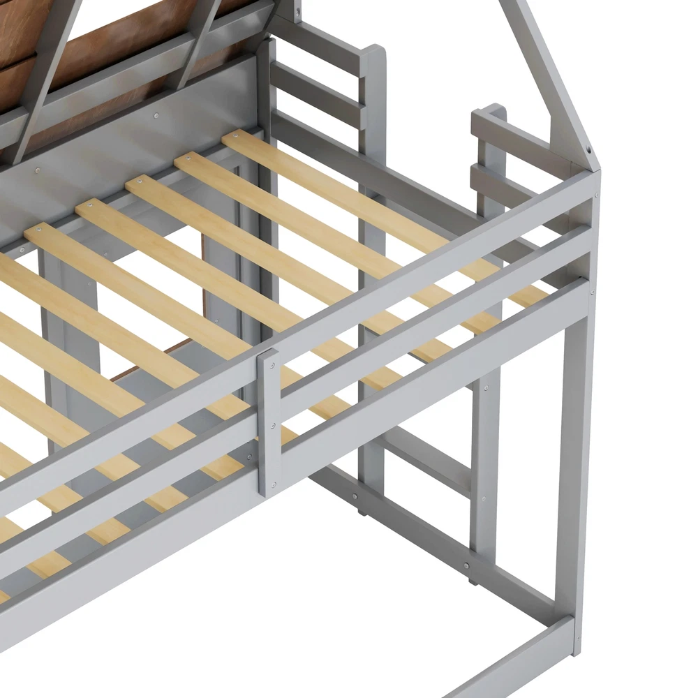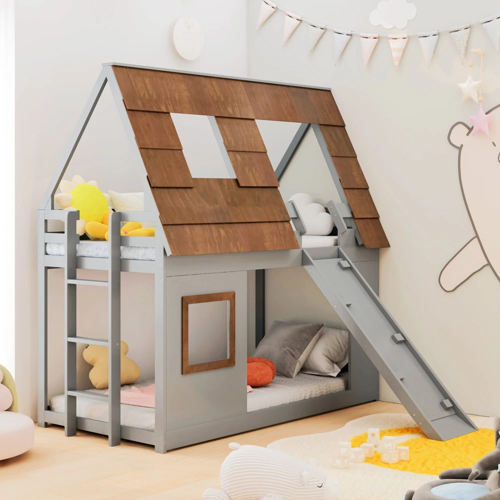 Product Features Dreamy House-Inspired Design: Our Twin Size House Shaped Bunk Bed will bring endless fun and surprises to your child. Designed in the shape of an adorable hut with a sloping roof and windows, this bed seems to be in a fairy tale world. Let your child wake up every day with passion and creativity in this unique bed. Safe and Stable Construction: Our bed is made up of high quality plywood, MDF and sturdy pine wood to ensure stability and durability. Equipped with reliable guardrails and sturdy pine frame to ensure your child's safety while sleeping or playing. The built-in ladder design makes the top bunk more convenient, allowing kids to climb up and down easily, improving the convenience of use. Multifunctional Design: This bed is not just a cozy sleeping space, but also a unique playground for children. The climbing ramp and side stairs allow kids to enjoy more fun while playing on the bed and develop their coordination and imagination. Children can climb up and down the bed, climbing ramp down the stairs and create their own happy time. Space-Saving Solution: Our double bed's clever design maximizes space in your child's bedroom. The bunk bed configuration allows for two beds in the floor space of one, leaving plenty of room for play and other furniture. Suotable for a Variety of Rooms: Whether it's your child's bedroom, playroom, or living room, this house styled bunk bed will fit perfectly into any space. Not only does it provide a cozy sleeping area, it also creates a unique and fun play corner for kids. Strong support and reliable stability:The bed frame is equipped with 14 wooden slats, providing strong support and long-term support for the mattress, creating an ideal nighttime sleeping experience for you. Easy to assemble: The simple design makes assembly very easy, all hardware and detailed instructions are provided, and the twin-size bed frame is easy to complete. Description Features: This Twin Size House Shaped Bunk Bed with Climbing Ramp and Side Stairs will bring endless fun and surprises to your kids. Stimulate your child's imagination while ensuring their safety and comfort. More than just a bed, it's the perfect space for your kids to spend quality time. Made from high-quality materials, this bunk bed will be your child's companion as they grow. Whether they are sleeping, playing or resting, this house styled bunk bed is the ideal choice for you.