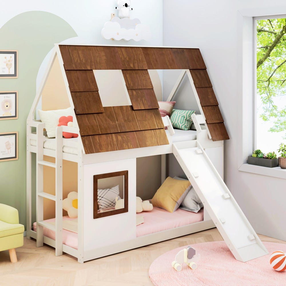 Product Features Dreamy House-Inspired Design: Our Twin Size House Shaped Bunk Bed will bring endless fun and surprises to your child. Designed in the shape of an adorable hut with a sloping roof and ...