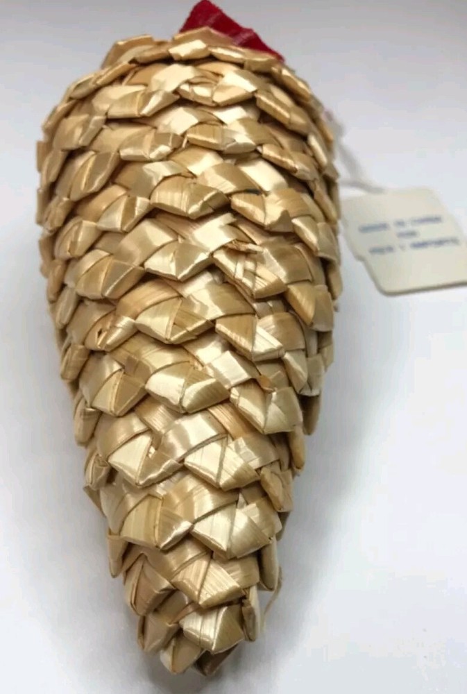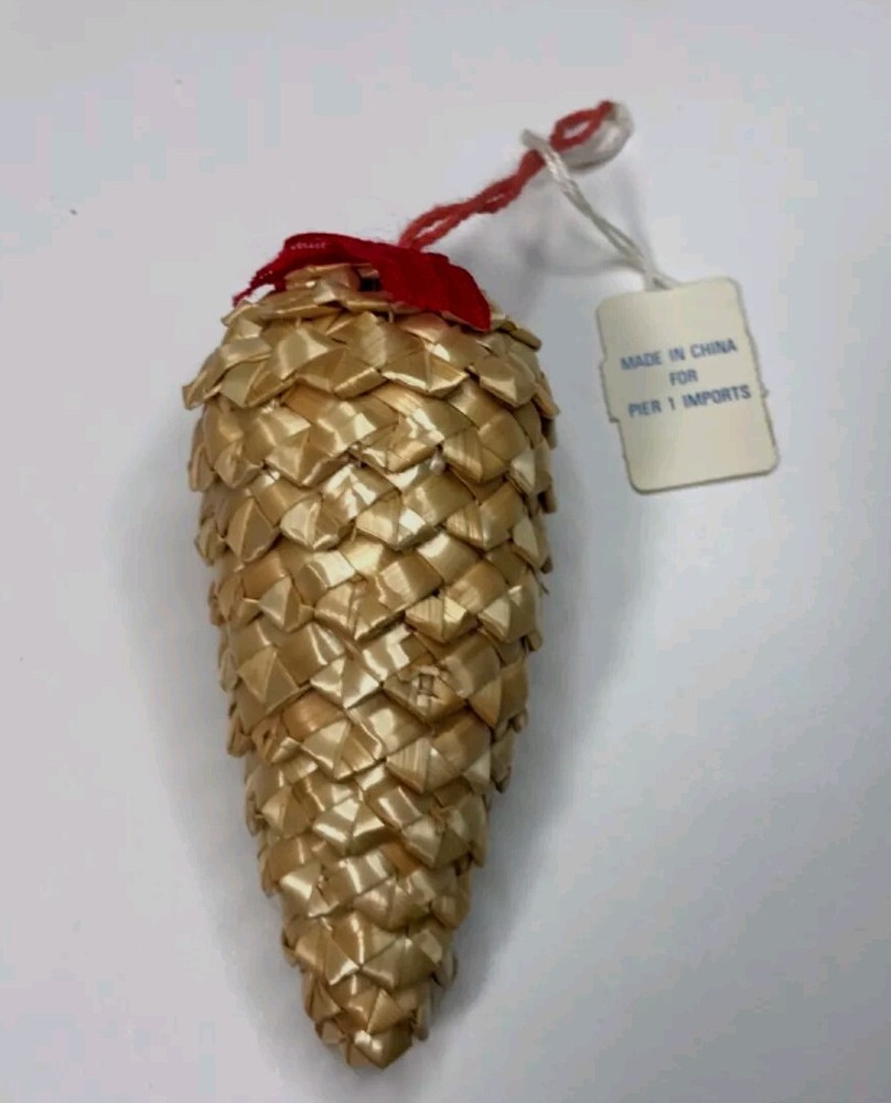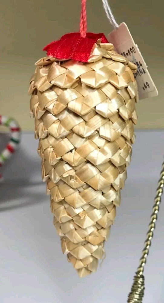 Add a touch of rustic charm to your Christmas decor with this handcrafted Pier 1 Imports pinecone ornament. Made from natural straw, this large 4-inch ornament features a intricate woven pattern that captures the essence of a winter's pinecone. With a contemporary style that compliments any holiday theme, this decorative piece is perfect for hanging on your tree or adding to your festive tabletop display. The ornament's durable construction and classic design make it a timeless addition to your collection. Although manufactured in China in 1993, this unique unit boasts a vintage appeal that will transport you back to a simpler time. Celebrate the season with this one-of-a-kind ornament that's sure to become a treasured part of your holiday tradition. New with Tag.