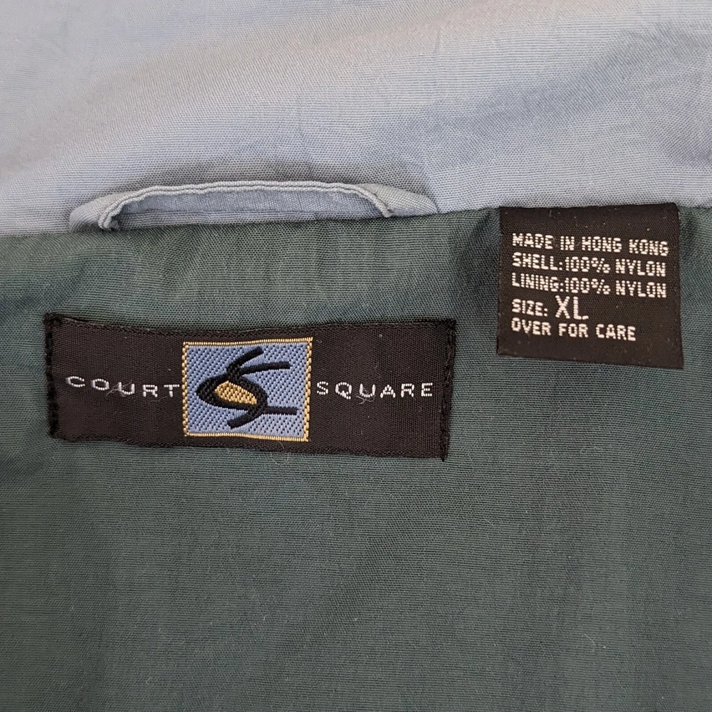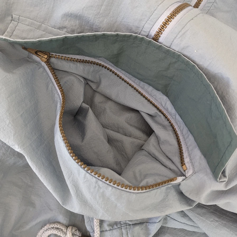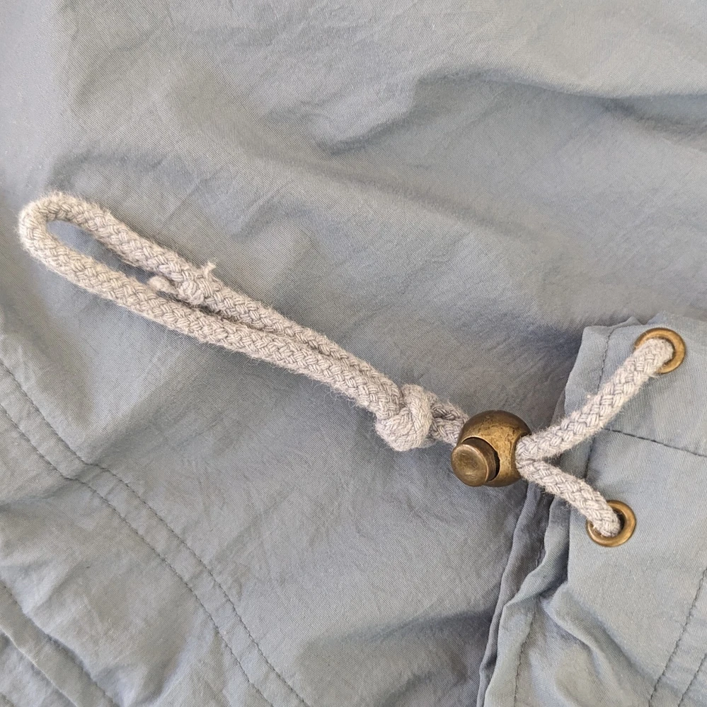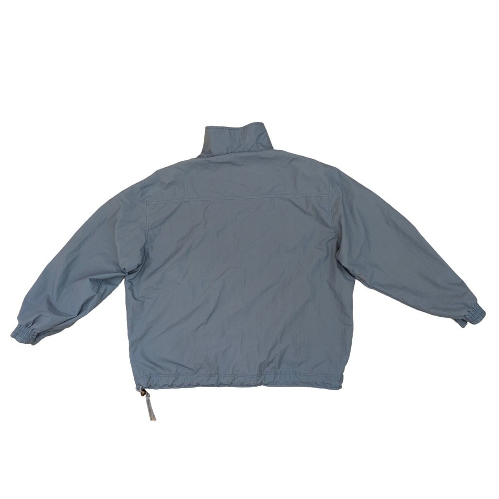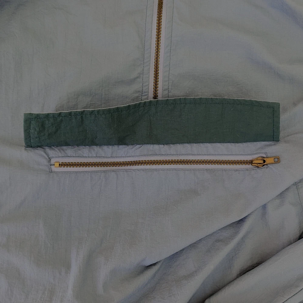 This vintage windbreaker is a fantastic find! The dusty blue color and brass hardware give it a cool retro vibe, and the lightweight nylon material is perfect for breezy days. Though it has minor wear like a small stain and slightly loose cuffs, it’s still super functional with great features like a drawstring waist, multiple pockets, and vented lining. Super comfortable and stylish—love it!