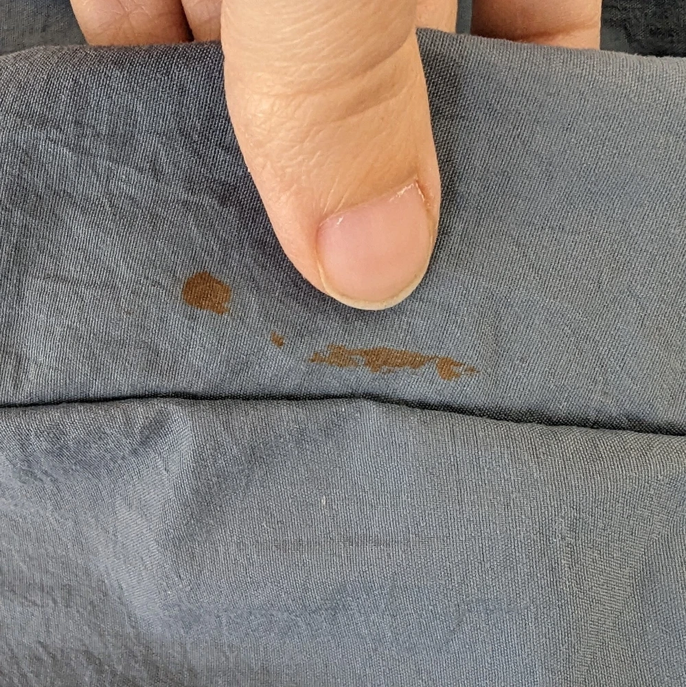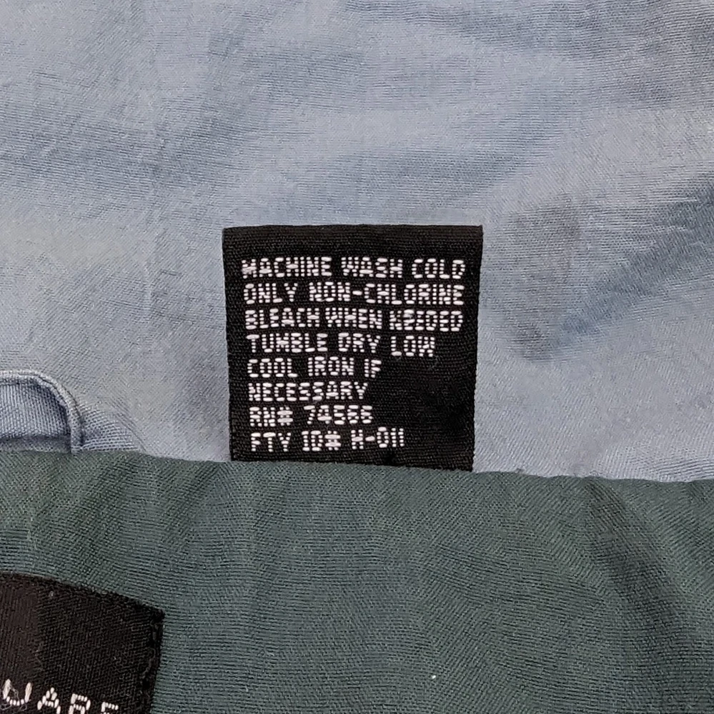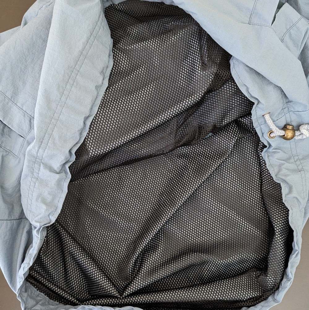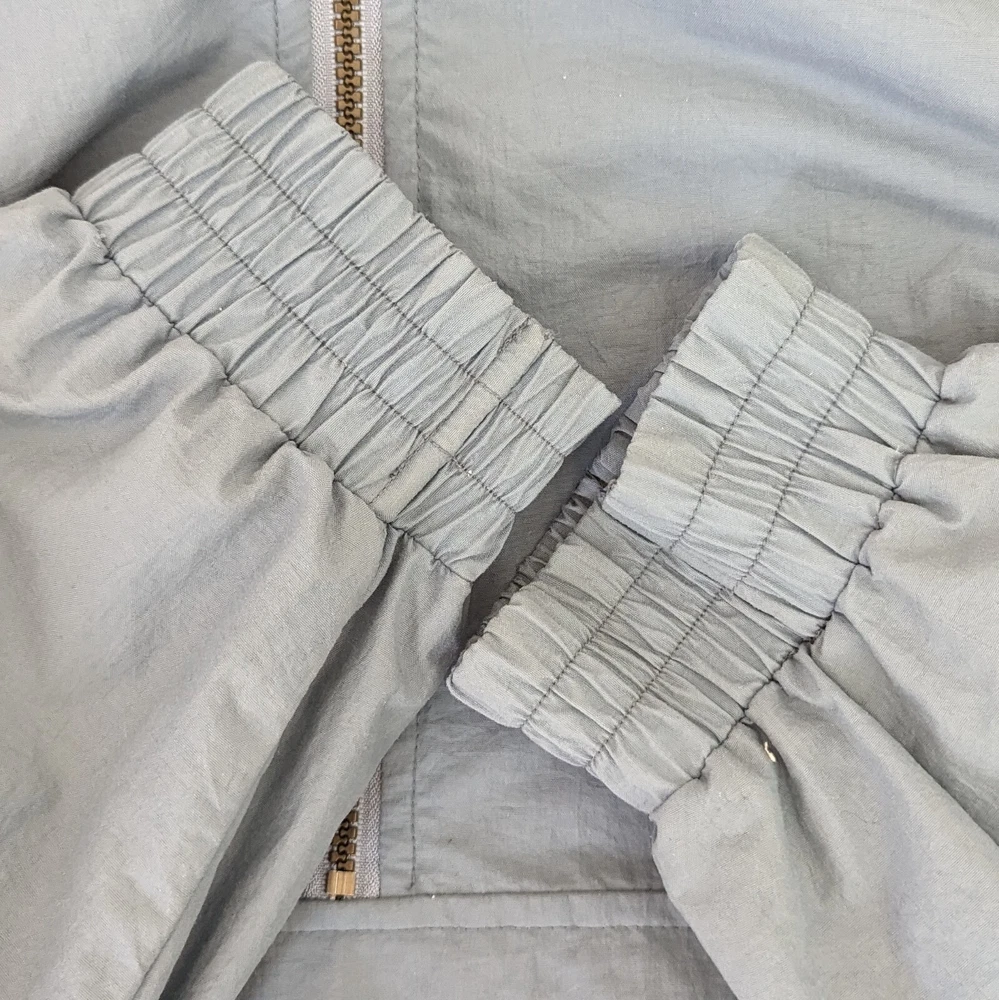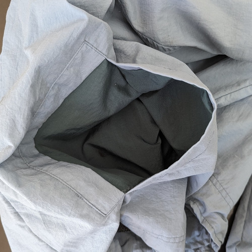 This vintage windbreaker is a fantastic find! The dusty blue color and brass hardware give it a cool retro vibe, and the lightweight nylon material is perfect for breezy days. Though it has minor wear like a small stain and slightly loose cuffs, it’s still super functional with great features like a drawstring waist, multiple pockets, and vented lining. Super comfortable and stylish—love it!