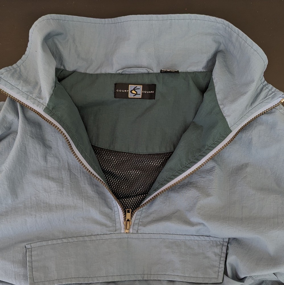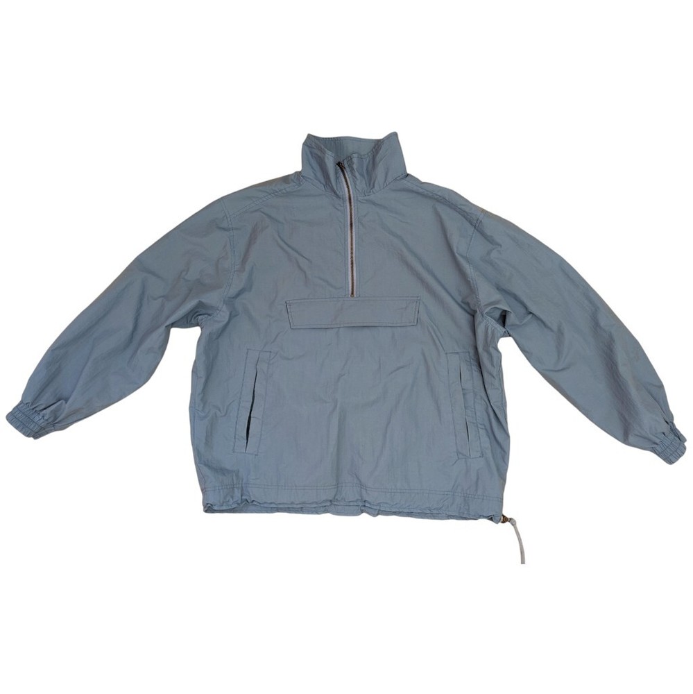 Vintage windbreaker with minor flaws - has a stained area on one arm, the drawstring at the waist is worn but still functional, and the elastic of one sleeve cuff has loosened. Men's XL - dusty shade of blue with brass colored hardware. 100% nylon (the type that makes noise when you move) that's wind and water resistant. Features 1/4 zip closure, zip close kangaroo pocket plus 2 side open pockets, adjustable drawstring waist, and vented mesh lining. Machine washable. Approximate measurements (flat/unstretched) 29" armpit to armpit 22" shoulder to shoulder 25" shoulder to bottom of sleeve 29" center back neck to bottom hem Item has been machine washed and dried. Please see photos for item details and feel free to ask any questions before purchase. Colors may vary slightly depending on screen settings.