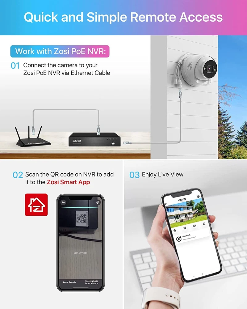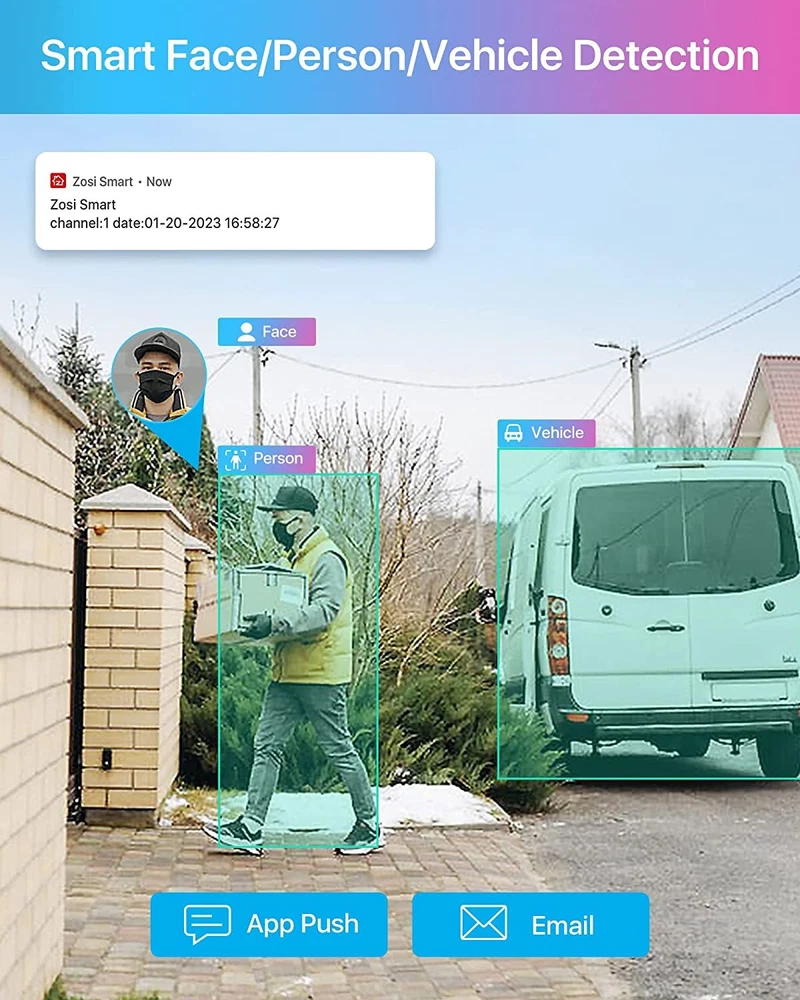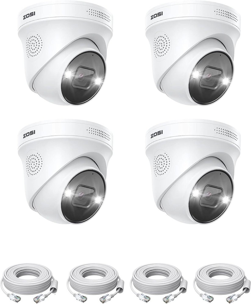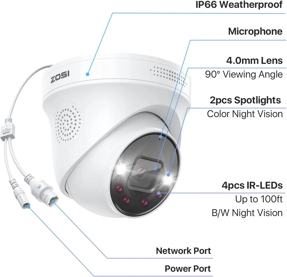 Noted: 1. This IP camera is an add-on camera. It needs to connect the Ethernet cable and NVR to work. Each 4K Outdoor Camera comes with an ethernet cable. 2. Only compatible with ZOSI PoE NVR(Model: ZR08DN/SN, ZR16DK/SK). 【Person Vehicle Detection & Smart Alerts】ZOSI smart camera has AI detection, it can more accurately detec person and vehicle, and you can custom the alerts specific areas to reduce unnecessary notifications. This Surveillance Camera equips with a siren and spotlight as a deterrent, reacting to any potential danger. 【Powered optional and easy installation】 This IP camera can be powered up by a Power supply, also it could be powered up by one Ethernet cable with a PoE switch, easy plug-and-play, only one Ethernet cable to run for both power & video transmission. 【IP66 Weatherproof and 2-Way Audio】Aluminum Metal vandal proof & IP66 Waterproof can withstand the toughest of outdoor conditions. This Camera support 2-Way Communication, not only hear but also can talk back. 【Noted】-- This Outdoor Security Camera could only work with the ZOSI PoE NVR. Each IP camera comes with an ethernet cable for connection. 4K Super HD Display Four times the resolution of 1080P.In 4K resolution.Record everything with sharper details with the high Pixel count and be able to digitally zoom into far away objects without losing any quality. High Dynamic Range This Ultra HD 4K CMOS Image Sensor allows the camera to capture more light,and turn on HDR mode to deliver crisp detail even in backlit environments for real-world visuals Four Night Vision Modes 1. Starlight Night Vision(Automatically) Capture more light and reveal vivid details even in very low light conditions with an advanced starlight sensor. 2. Smart Night Vision(Manual Setup) Heat & motion turn on the spotlights, enabling color night vision. 3. Full Color Night Vision(Manual Setup) Illuminate your way at night, full-color image and video let you see more valuable details. 4. Infrared Night Vision(Manual Setup) Infrared LEDs on, image is black and white. Intelligent AI Person/Face/Vehicle Detection Avoid annoying false alerts with intelligent AI person, face and vehicle detection. You‘ll be notified via App push and emails upon detection of humans and cars. Turn Your Camera into a Walkie-Talkie Not only watch ultra clear live video, you can also hear and talk directly to anyone who approaches via 2-way audio. Only Work with ZOSI PoE NVR This IP camera is only compatible with ZOSI PoE NVRs (model:ZR08SN/ZR16SK), enable to protect every corner of your house 24/7. Personalize Your Detection Only receive alerts that matter. Customize the area where detection happens to fit your home and reduce false alerts. Smart Sound And Light Alarm Once any person/motion is detected, built-in powerful spotlights and siren will be triggered to warn off the unwelcomed. Remote Access Anytime&Anywhere Get quick access and control to your cameras whenever and wherever via: · Free Zosi Smart App on your mobile device · Free AVSS Client on your PC/Mac Versatile Installation The cameras can be mounted on a ceiling or wall. It’s simple to place anywhere you need for seamless protection. Built for Indoors & Outdoors The protection level of this camera is IP66, and the shell is made of metal, which can effectively block sand, dust and wind and rain erosion. Suitable for indoor and outdoor installation. Max Support 100 Meters Cables Transmission The distance greatly increases the convenience of home installation, and it is installed in the place where you want to monitor the most Why Choose PoE? 1. Truly Digital: 100% video quality preservation over long distance transmission. 2. Secure Transmission: Video feeds are encrypted before transmission, making data interception difficult. 3. Ease of Installation: a single ethernet cable transmit power, video and audio.