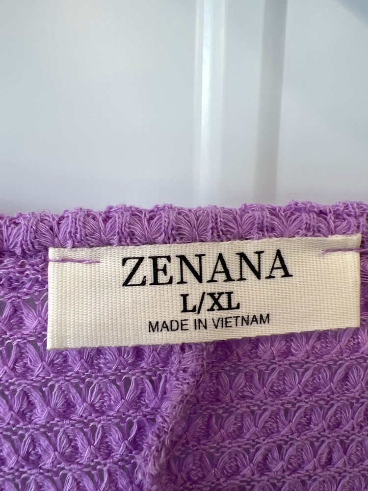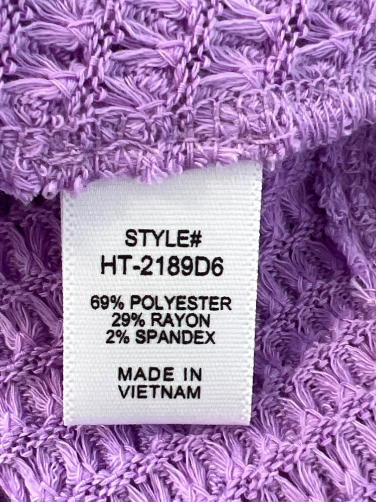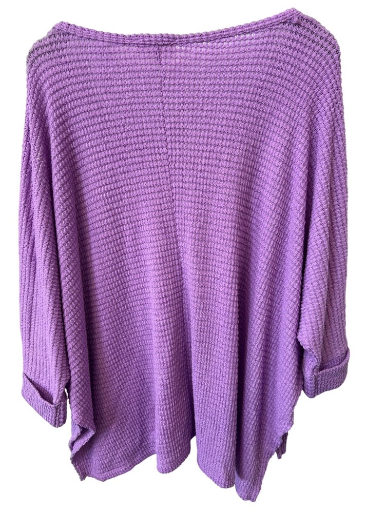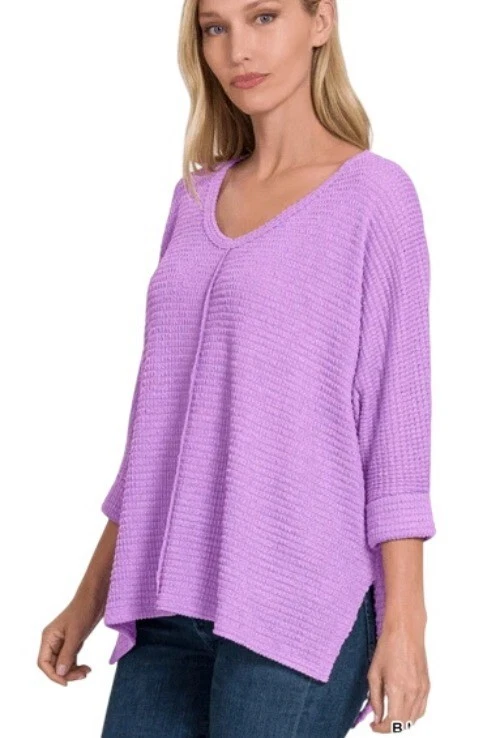 Zenana V Neck Hi Low Hem Jacquard Sweater Size Large/XL 3/4 Sleeve Lavender Cozy This lightweight waffle knit top by Zenana offers a stylish and comfortable fit. Featuring a relaxed silhouette and rolled sleeves, it’s versatile for layering or wearing alone. • Waffle knit texture • V-neckline • Rolled sleeve design • Relaxed fit with ample coverage • Lightweight and breathable fabric • 69% Polyester 29% Cotton 2% Spandex • Made in Vietnam Chest = 27 in Length = 36 in casual classic comfortable relaxed fall winter warm knit cozy comfy loungewear everyday closet staple modern essentials daily