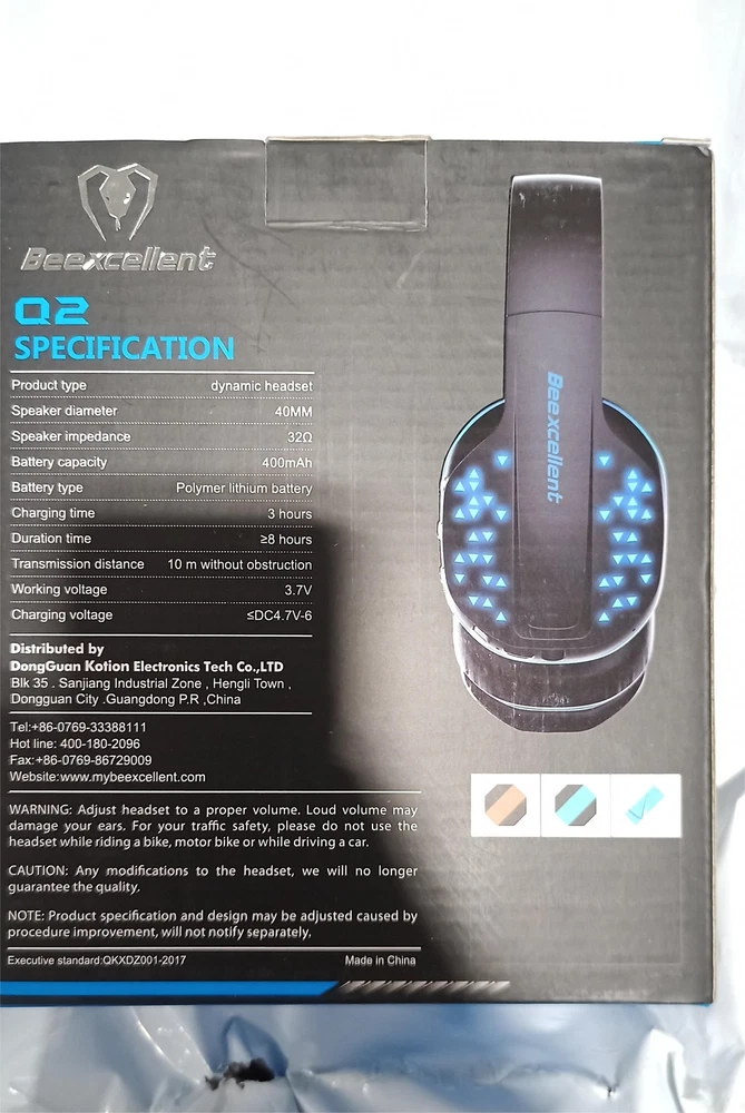 Oversized round ear wrap, sound insulation and comfortable. This Headphone is specially designed for game lovers and music enthusiast, which features Advanced Wireless Bluetooth 4.1Technology, built-in high-grade Microphone and speaker, hands-free function and lightweight . A super companion for you during daily life. Outstanding quality, let you enjoy an unprecedented experience of hearing. Suitable for various head types. Features: Advanced Bluetooth Technology : Latest Wireless Bluetooth 4.1 Technology, the transmission speed is faster and more stable, can effectively reduce the sound quality damage. Hands-free Function : It enables you to pause or play music, answer or end the phone with one button. With built-in microphone, it supports hands-free function, set your hands free. Unique Design : Skin-friendly silicone pad in the head beam will give you soft and comfortable feeling. Press the LED light to light up,180 degree rotary soft glue microphone, easy to bend and adjust the position. Endurance Time: Built in rechargeable 400mAh lithium polymer battery, the longest standby time can be up to 8 hours and universally compatible with most Bluetooth-enabled devices. Noise Isolation: The high sensitivity microphone delivers more accurate , clear and smooth speech. It can keep you away from the noise and immerse in music or gaming world. Specifications: Brand: Beexcellent Model: Q2 Bluetooth Version: Bluetooth 4.1 Frequency Response Range: 20 Hz- 20K Hz Operation Range: Up to 10 meters Microphone: Built-in high-sensitivity microphone (-38±3dB). Impedance: 32 Ω Sensitivity: 108±3 dB Battery: 400mAh Rechargeable Li-ion battery Standby Time: About 8 hours Charge Time: About 3 hours Charge Port: Micro USB Color: Black and Blue Main Item Size: 17.4cm * 7.6cm * 4.2cm / 6.85in * 3.1in * 1.65in Main Item Weight: 286g / 10.14oz Package Size: 20.6cm * 17.6cm * 9.3cm / 8.1in * 6.9in * 3.7in Package Weight: 442g / 15.62oz Package List: 1 * Headset 1 * USB Cable 1 * 3.5mm Audio Cable 1 * User Manual