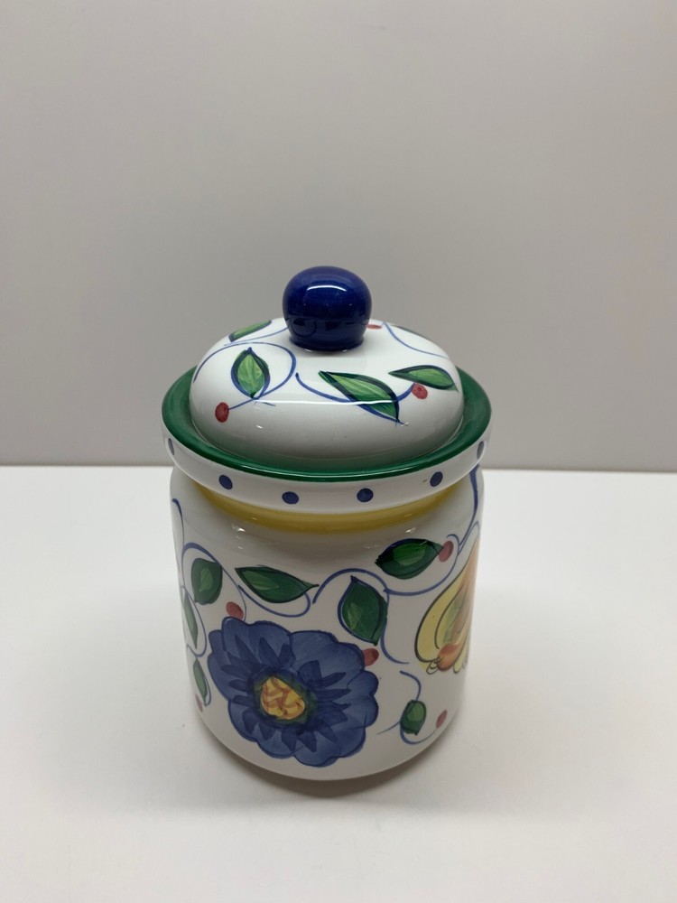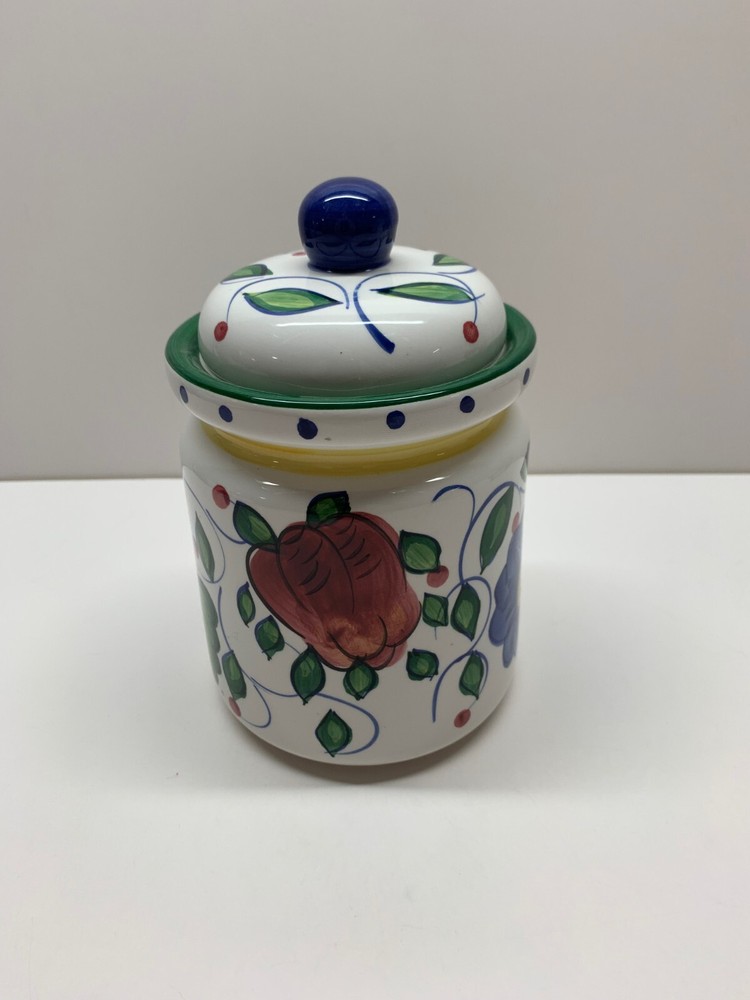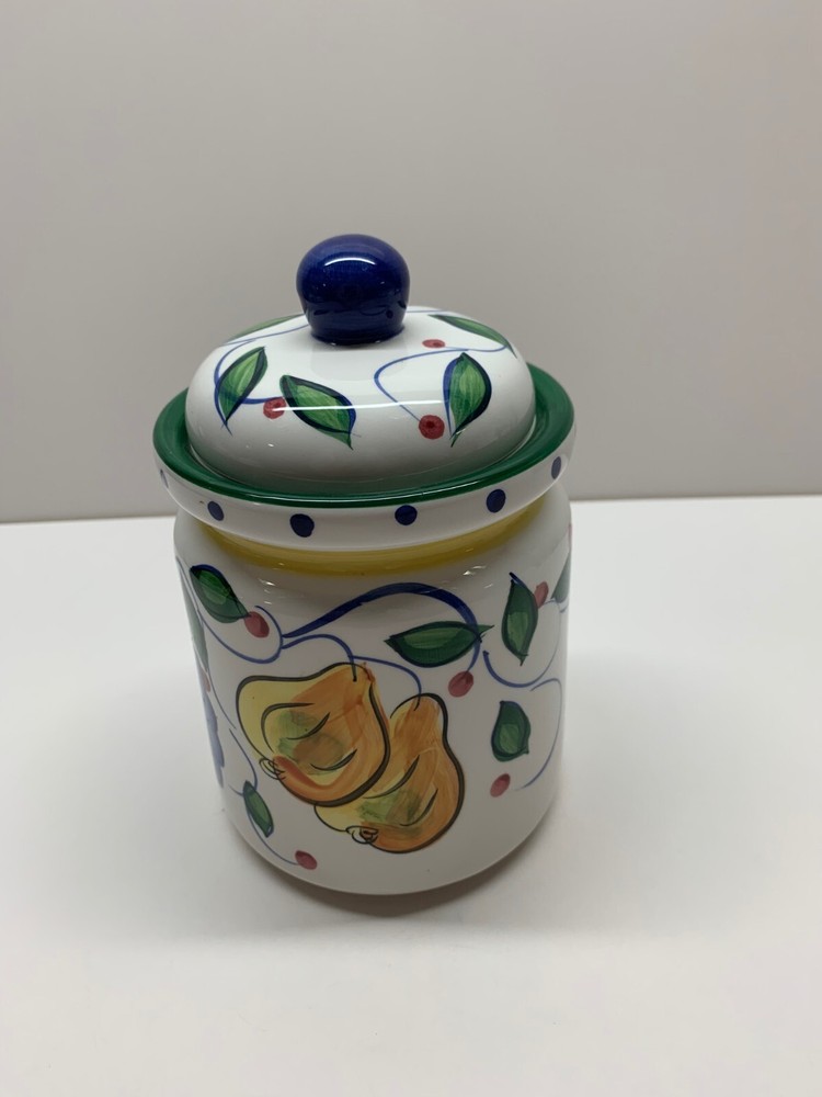 jay import fruit design ceramic canister tea with lid with rubber seal approx. 7" tall to top of knob x 5" tall not including lid x 4 1/8" across top No cracks or chips. In very good pre-owned conditi...