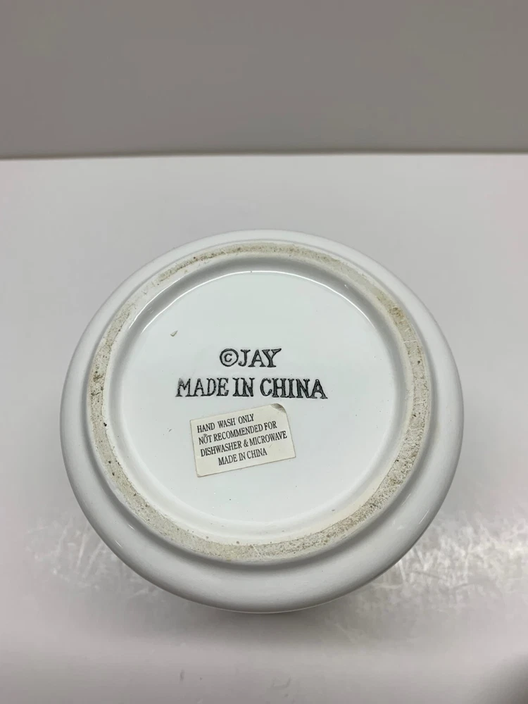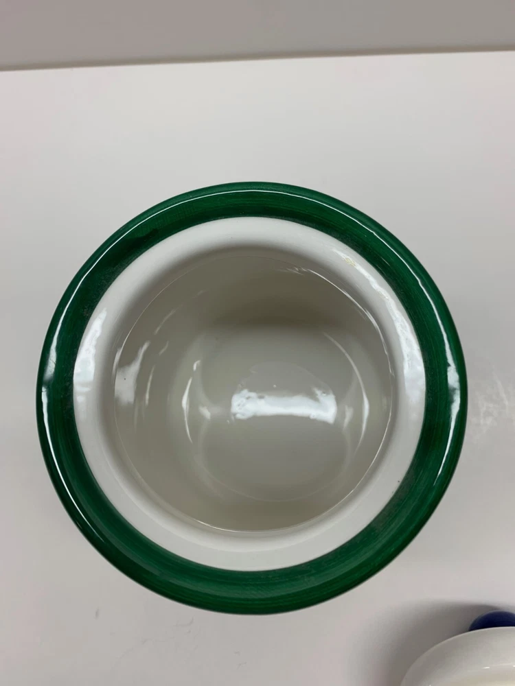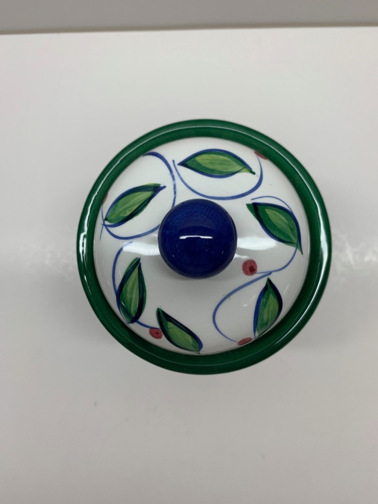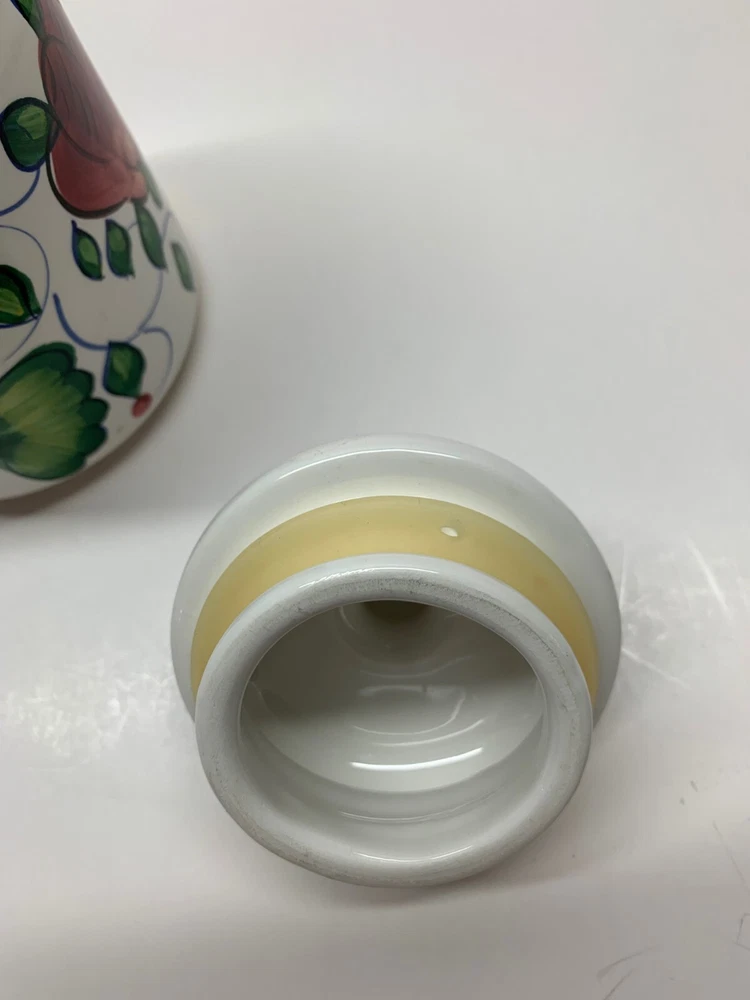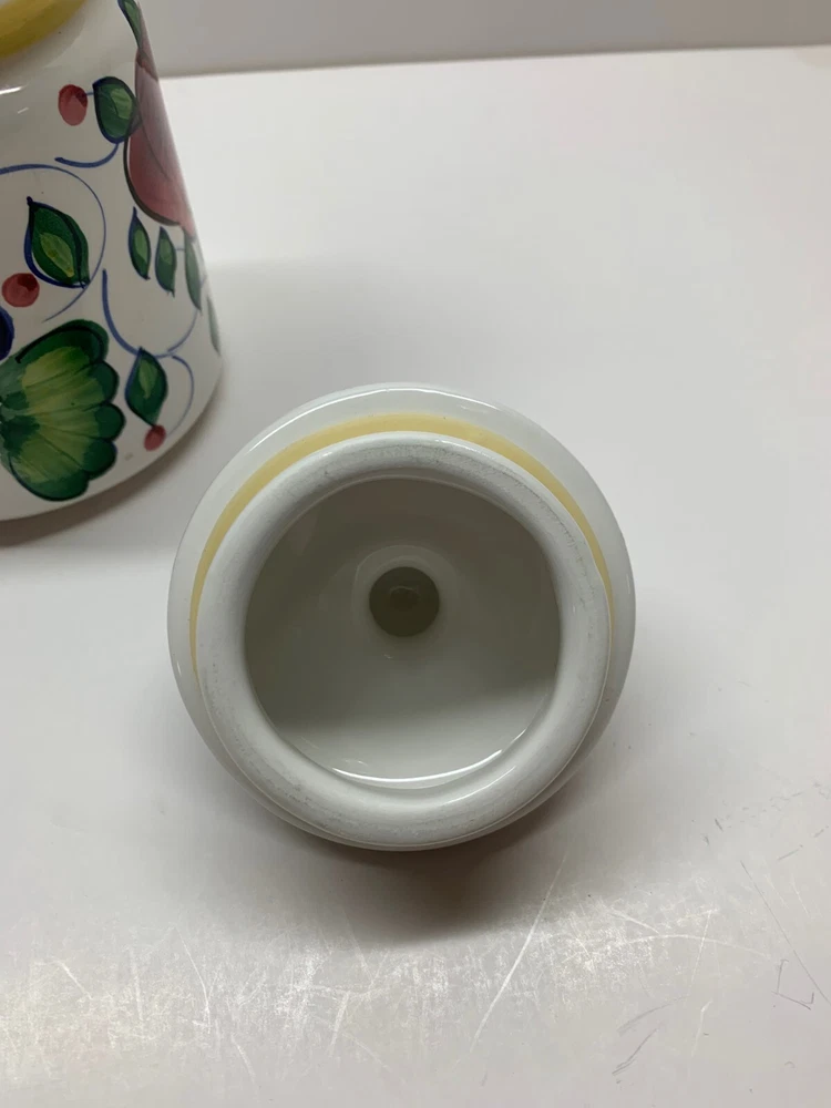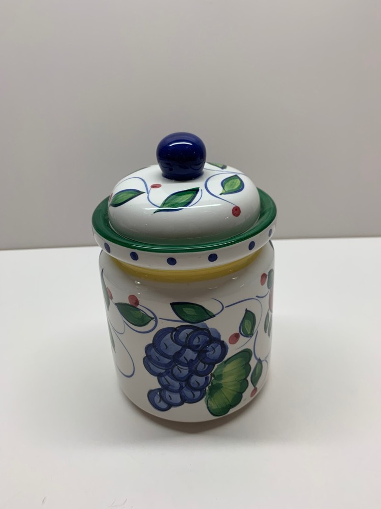 jay import fruit design ceramic canister tea with lid with rubber seal approx. 7" tall to top of knob x 5" tall not including lid x 4 1/8" across top No cracks or chips. In very good pre-owned condition. Please see photos.