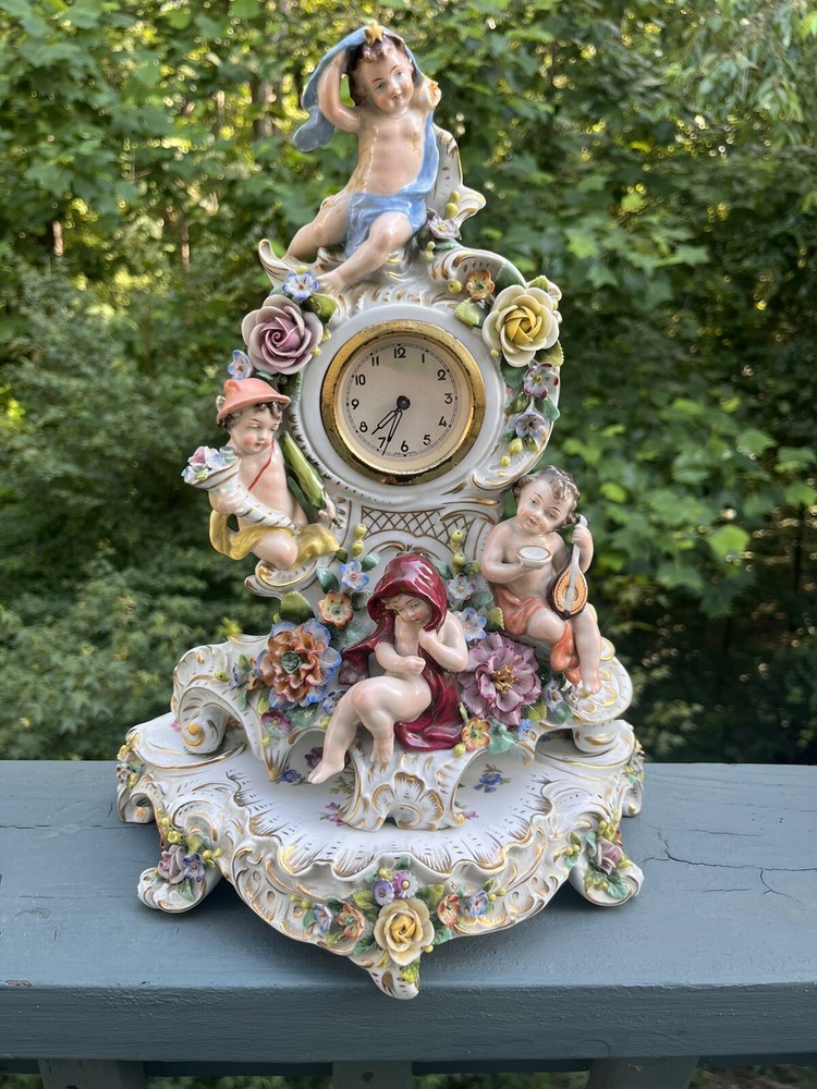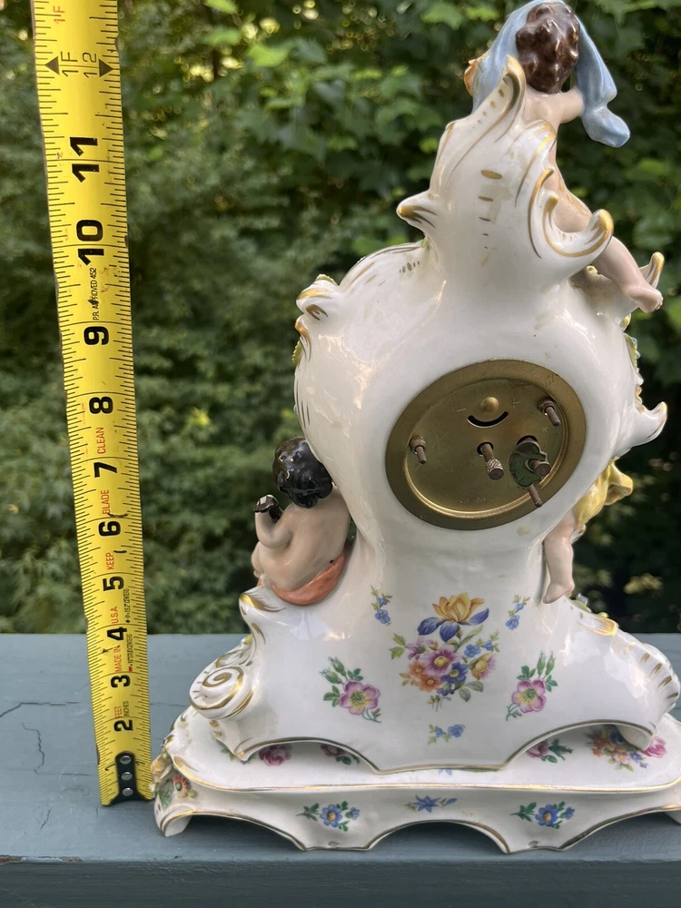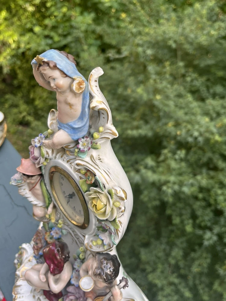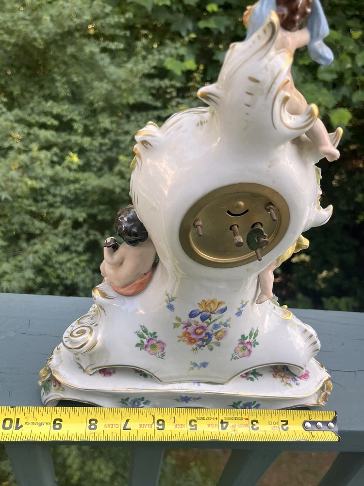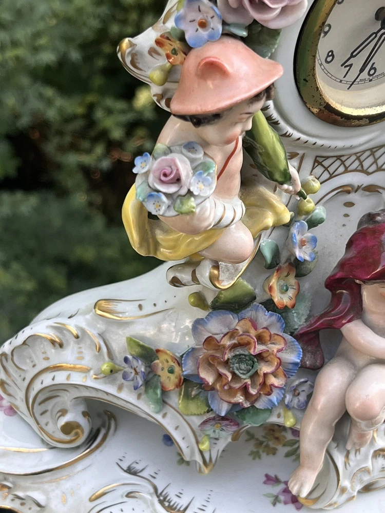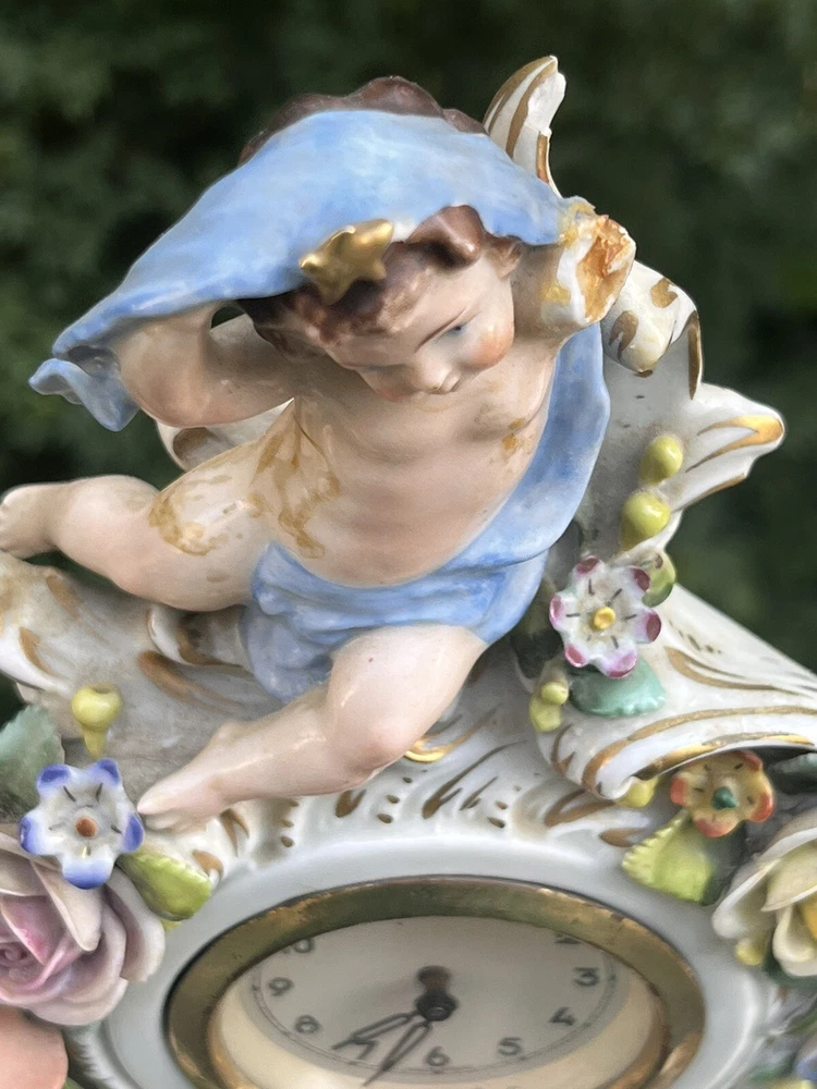 large Antique Sitzendorf Dresden Porcelain mantle Clock on the matching pedestal; featuring cherubs in four seasons alegory. Click is in working condition, ticking. Top cherub has damage to the hand and stains, please see pictures. Otherwise great condition.