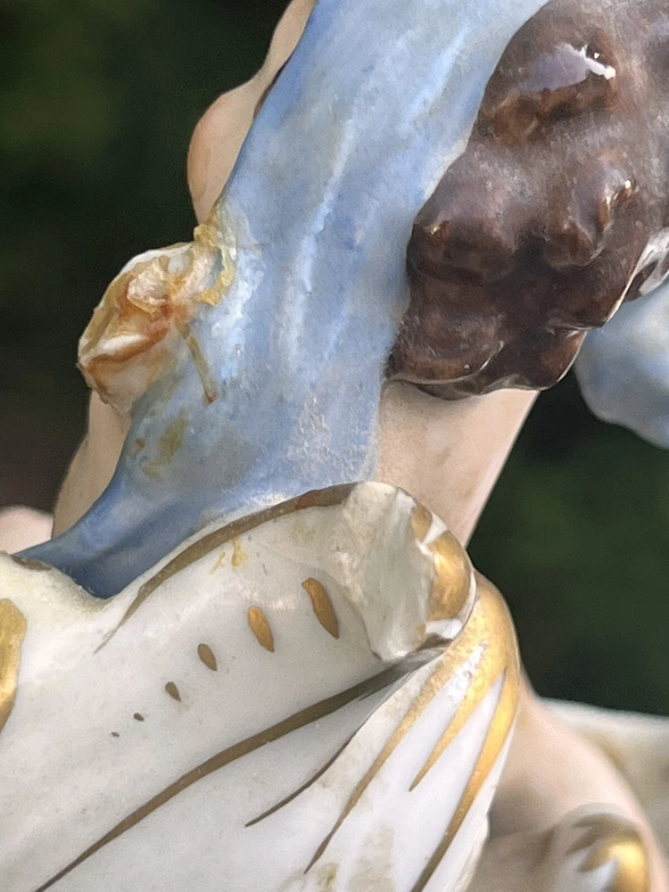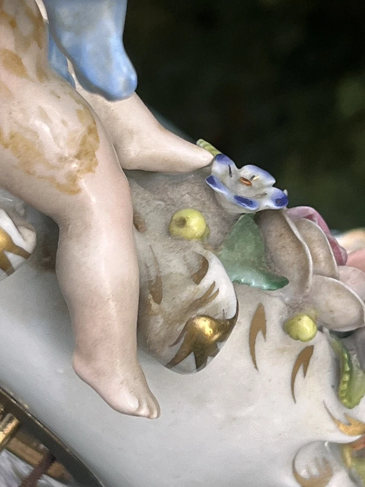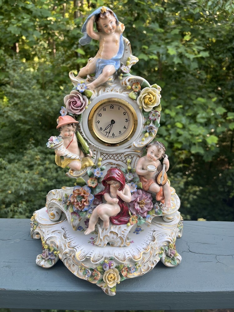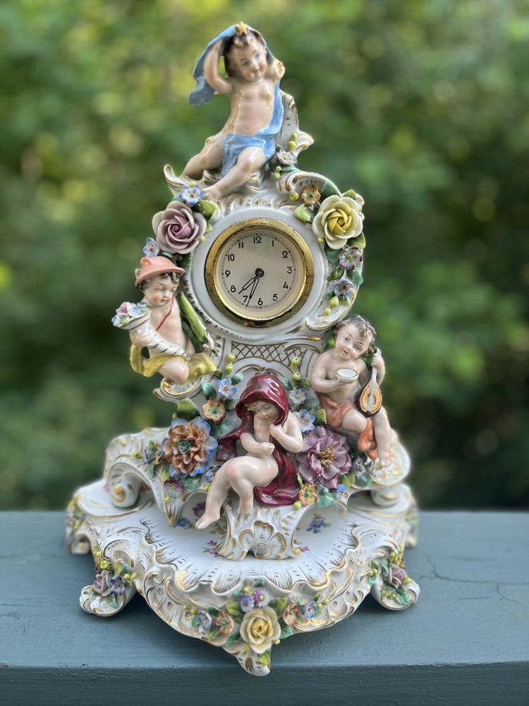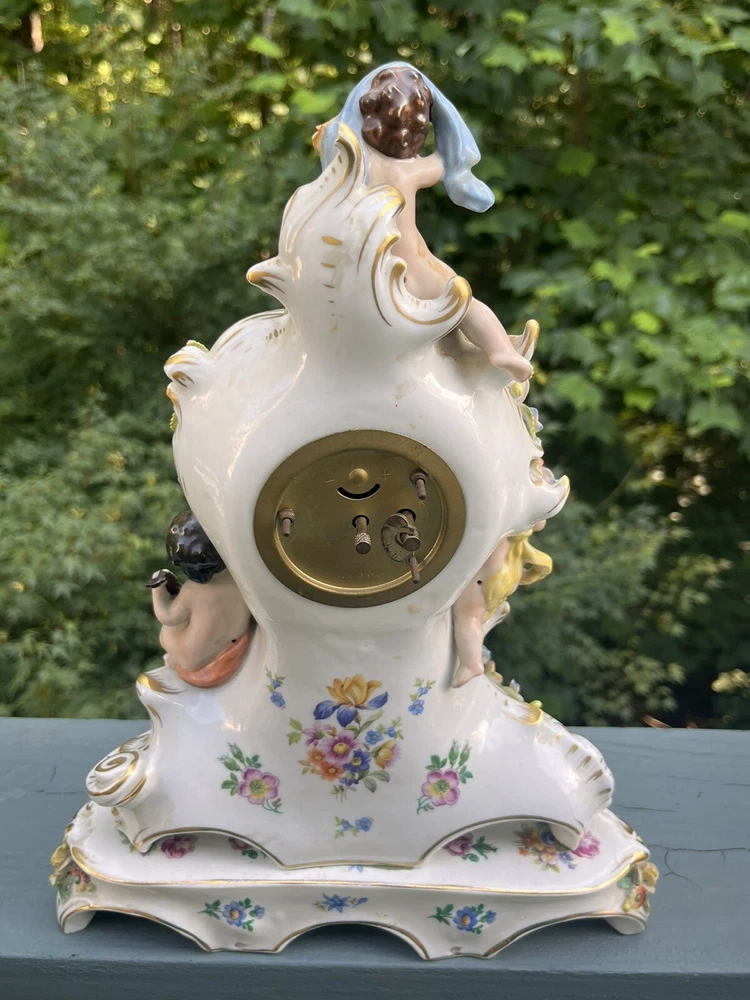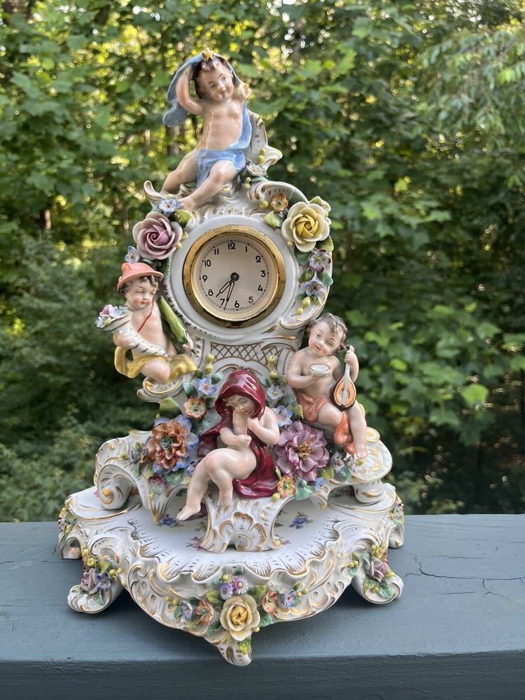 large Antique Sitzendorf Dresden Porcelain mantle Clock on the matching pedestal; featuring cherubs in four seasons alegory. Click is in working condition, ticking. Top cherub has damage to the hand and stains, please see pictures. Otherwise great condition.