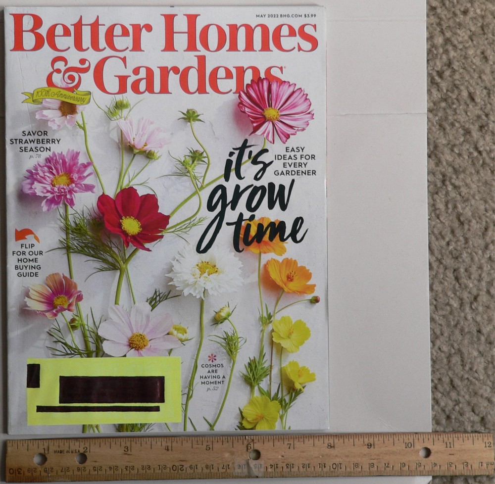 Better Homes and Gardens home economics, gardening, and interior design magazine ꙮ There's still no substitute for having the genuine, physical, paper version of a magazine! ꙮ ✅ published by Meredith Corporation, of Des Moines, Iowa (i.e., Des Moines, IA 50309), United States of America (USA) ✅ It is published 12 times a year (i.e., monthly). ✅ It could be described as a vibrant, down-to-earth guide for modern women. ✅ brand slogan of the magazine: "life in color" ✅ May, 2022 issue (volume 100, number 5) (2020s era) . . . . . . . . . . . . . . . . . . . . . . . . . . . . . . . . . . . . . . . . (see photos above) ✅ an actual, authentic magazine, not a copy or reproduction ✅ cover (or single-issue) price: $3.99 ✅ subscription price: $9.98 / year ✅ It measures ~ 8 in. wide ͯ 10 ½ in. tall (i.e., what may be called a typical magazine size) . ✅ full- c o lo r photos and illustrations ✅ numerous informative advertisements for new and existing products and services ✅ International Standard Serial Number (ISSN): 0006-0151 ✅ 108 pages ✅ common padded / glued binding . . . . . . . . . . . . . . . . . . . . . . . . . . . . . . . . . . . . . . . . . . . . . . . . . . . . . . . . . . . ( see photos above) ✅ feature articles (26) (table of contents): _ . . . . . . . . . (see photos above) > "Editor's Letter" (by Stephen Orr, Editor in Chief) > "BHG.com" (Better Homes and Gardens . com) > "Cookbook" > "Style Maker" > "The Main Event" > "Gifts" > "Decoding" > "Throwback" (memories of the past) > "Pro Moves" > "Editor's Picks" > "Heaven Scent" > "With a Fresh Eye" > "Strawberry Season" > "Bite-Size Gardens" > "Entertaining" > "Curb Appeal" > "Hands-On" > "Renovation" > "Kitchens" > "Plantings" > "I Did It! " > "Gatherings" > "Just One Thing" > "The Guide" > "Health" > "Pets" "Owning It" (4) (Guide to Buying Your First, Next, and Best Home): > "First Steps" > "Know Your Finances" > "Make a Plan" > "Learn From Others" ____________________________________________________________________________ ✅ UPC code: 0 72440 14060 8 (072440140608) ☑ International Article Number (or European Article Number) (EAN): unknown ☑ Ebay product ID (ePID) (Ebay catalog ID, or stock keeping unit (SKU)): does not apply ✅ Amazon ( Amazon . com) Sta ndard Identification Number (ASIN): B0131HO9J6 Sorry, it can't ship by USPS Media Mail (economy service), because it contains advertising. µ It ships from the United States (USA) (i.e., I am a domestic-based seller). I offer multiple-item combined-for-discount shipping. ♲ I recycle packaging, which helps the environment and reduces shipping costs. ֍ As always, any questions you may have are always welcome, to ensure the best buying experience. ֍