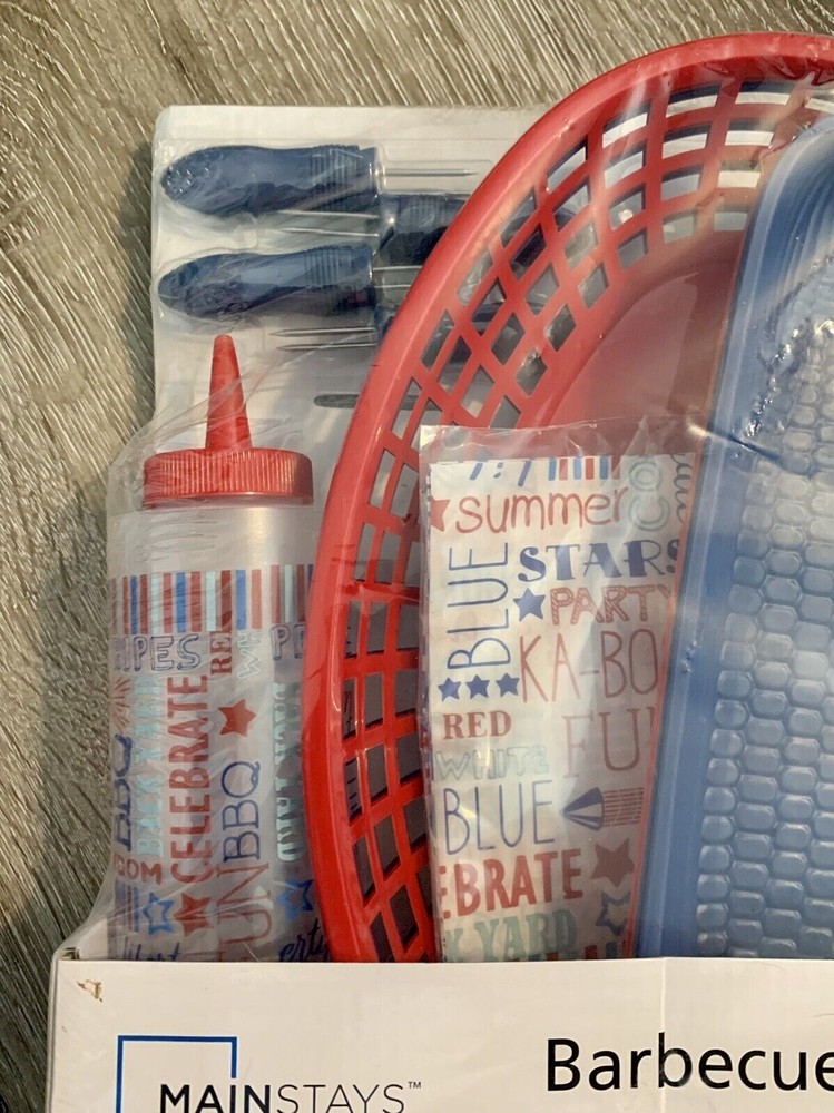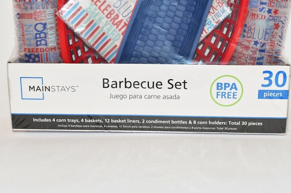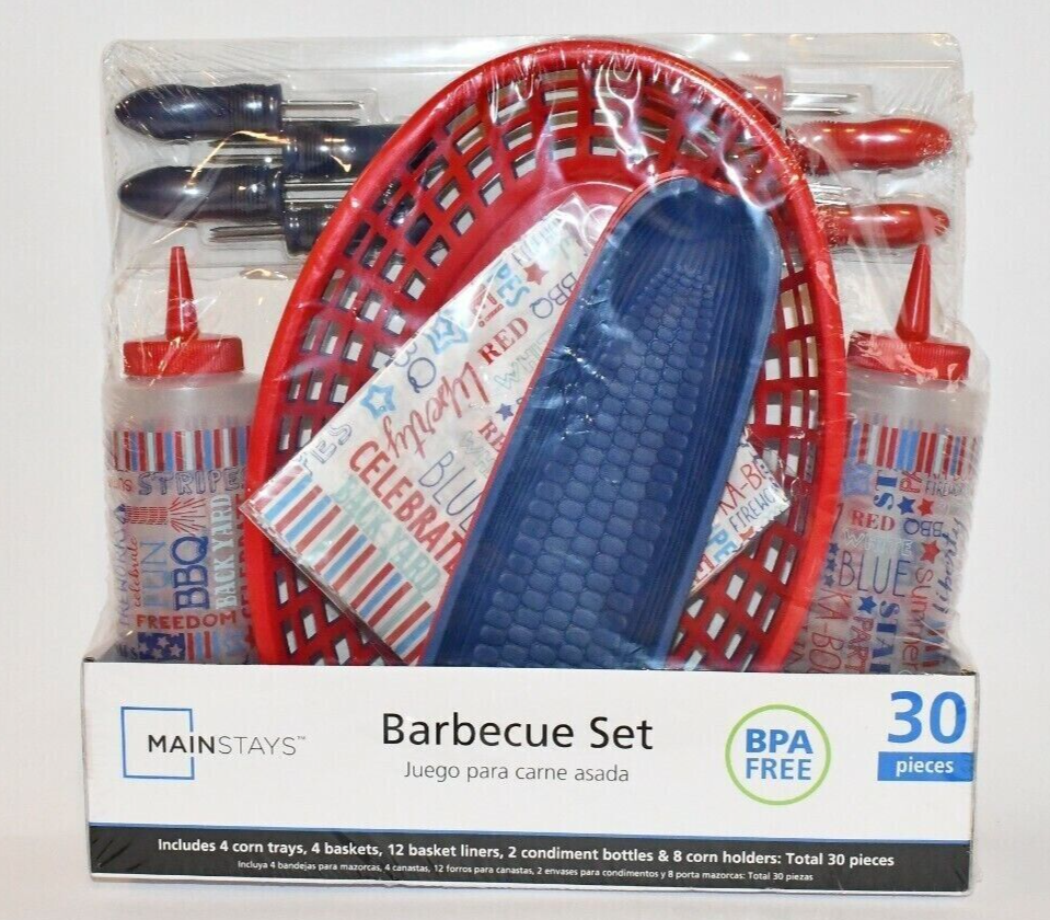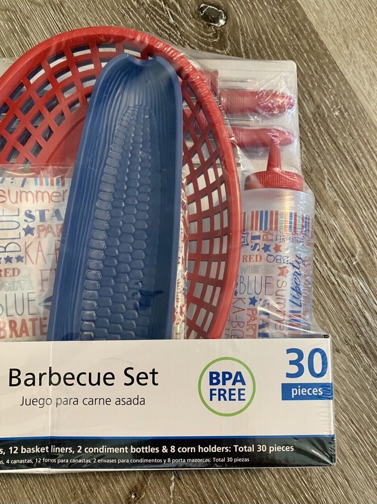 New Mainstays 30 Piece Barbeque Set BBQ Party Set BPA Free Brand New. This is a great 30 piece BBQ set included is 8 corn holders with 4 corn trays so you can butter the corn with ease also included is 4 baskets and 12 basket liners with 2 condiment bottles the kit is brand new sealed in the packaging great for parties cookouts and celebrating outdoors multicolored real nice set easy to clean and reusable