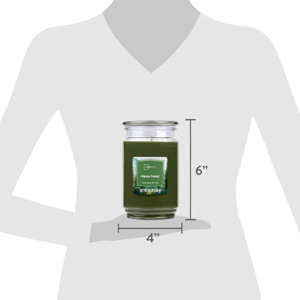 (pack of 2) Mainstays Alpine Forest Scented Single-Wick Glass Jar Candle, 20 oz Product description: Introduce a soothing aroma into your living space with the Mainstays Alpine Forest Scented Single-Wick Glass Jar Candle. Mainstays scented candles are highly fragranced and provide a clean and even burn that will fill your home with beautiful and enticing seasonal aromas. Place this candle in the kitchen, living room or dining room where you can enjoy it when entertaining guests or anytime you want to relax. Trim the wick periodically to promote even burning. Mainstays offers a wide selection of candle scents to explore and enjoy. Shop all of our Mainstays scents online and in-store. Treat yourself to the enticing scent of the Mainstays Alpine Forest Scented Single-Wick Glass Jar Candle. About this item: Mainstays Alpine Forest Scented Single-Wick Glass Jar Candle, 20 oz Alpine Forest features woodland herbs and a hint of wood smoke swirl with fragrance cypress and wild orange, leafy green, red cedar and touches of harvest leaves Complements virtually any room decor 20 oz. single-wick candle burns for approximately 100-120 hours Features a decorative beveled edge glass vessel Mainstays single-wick scented candles are highly fragranced, and provide a clean and even burn that will fill your home with beautiful and enticing aromas Our candles are made from high quality, non-toxic, clean-burning wax that is specifically developed to hold optimal fragrance loads Our Mainstays 20oz candle is available in a variety of scents