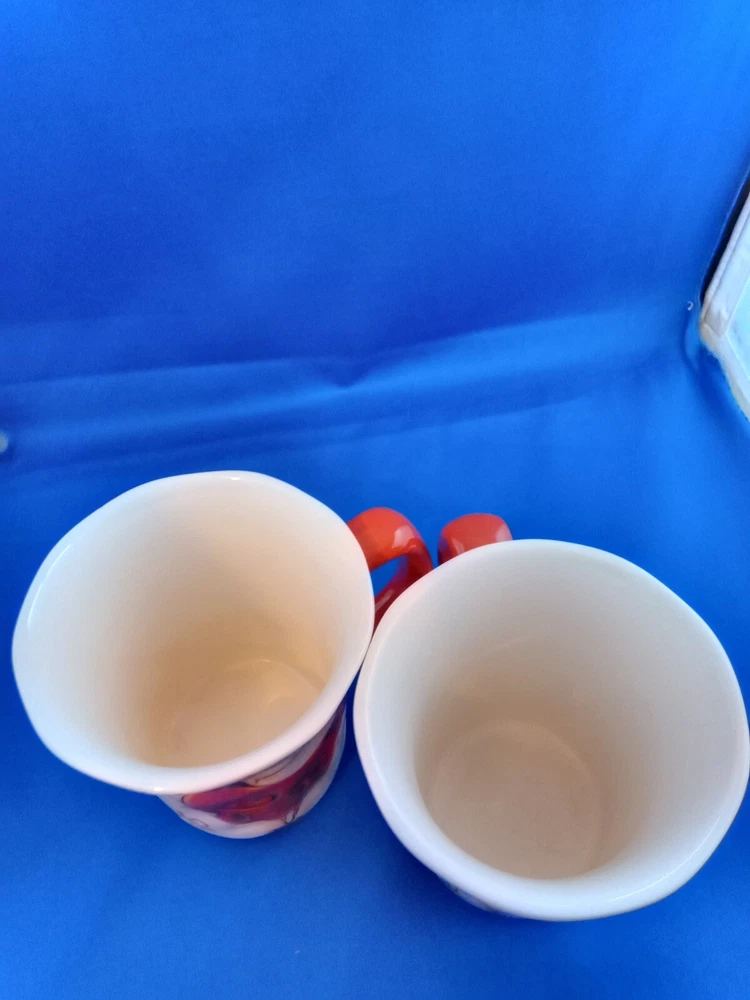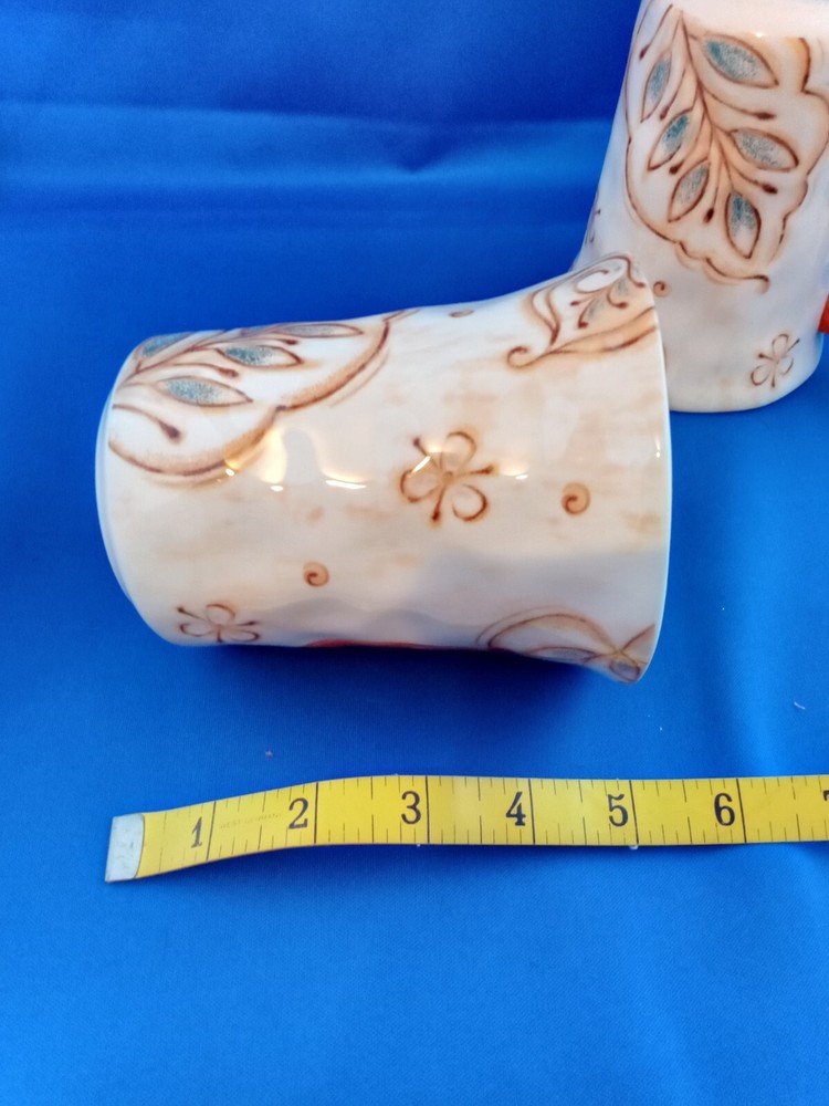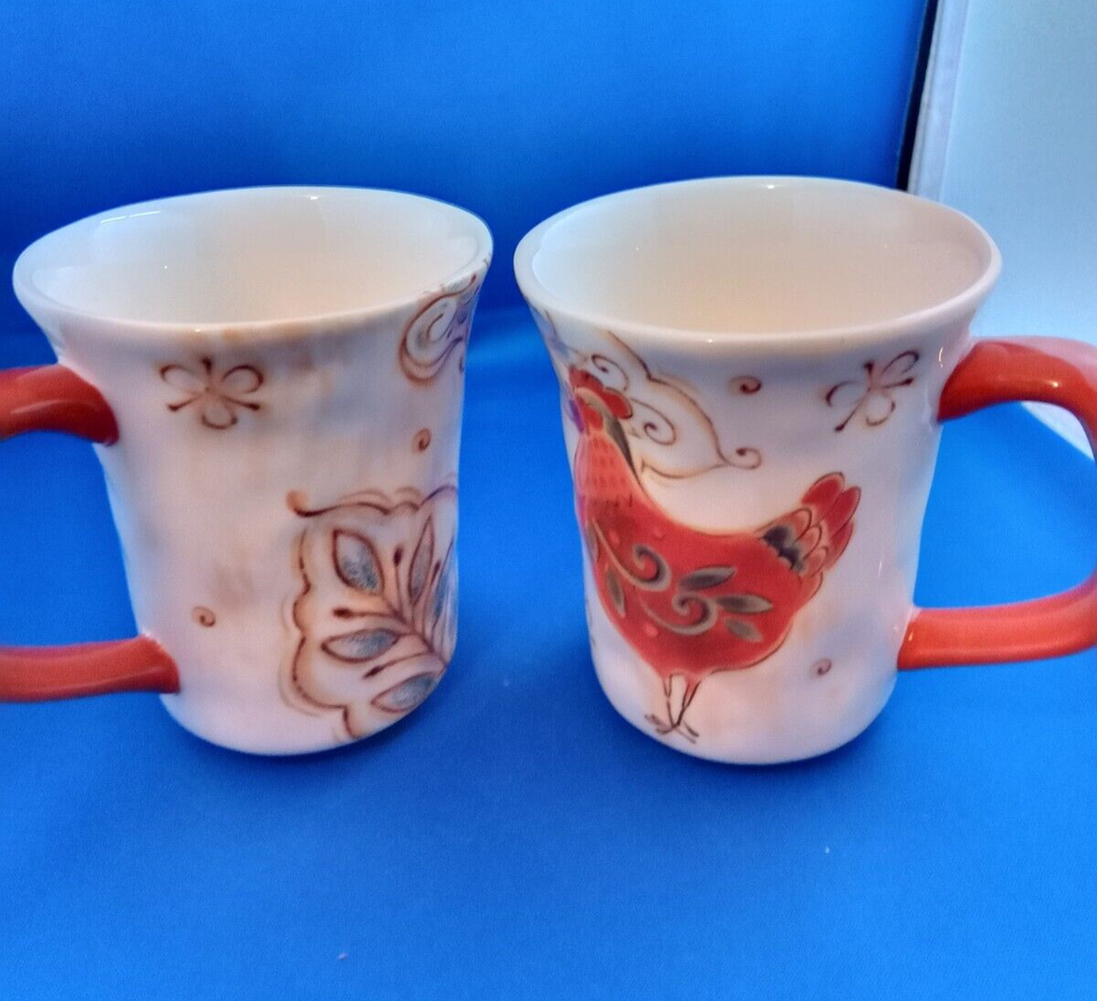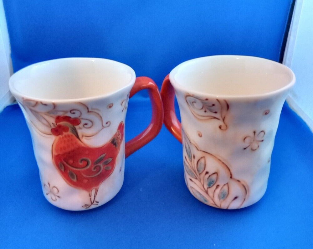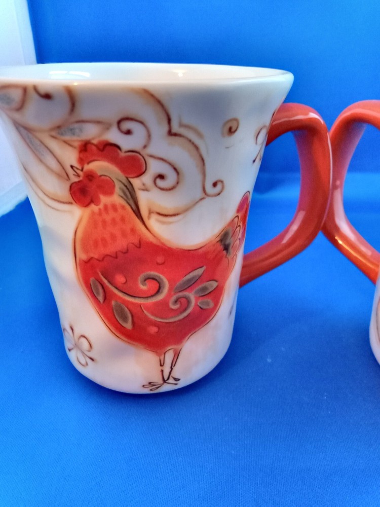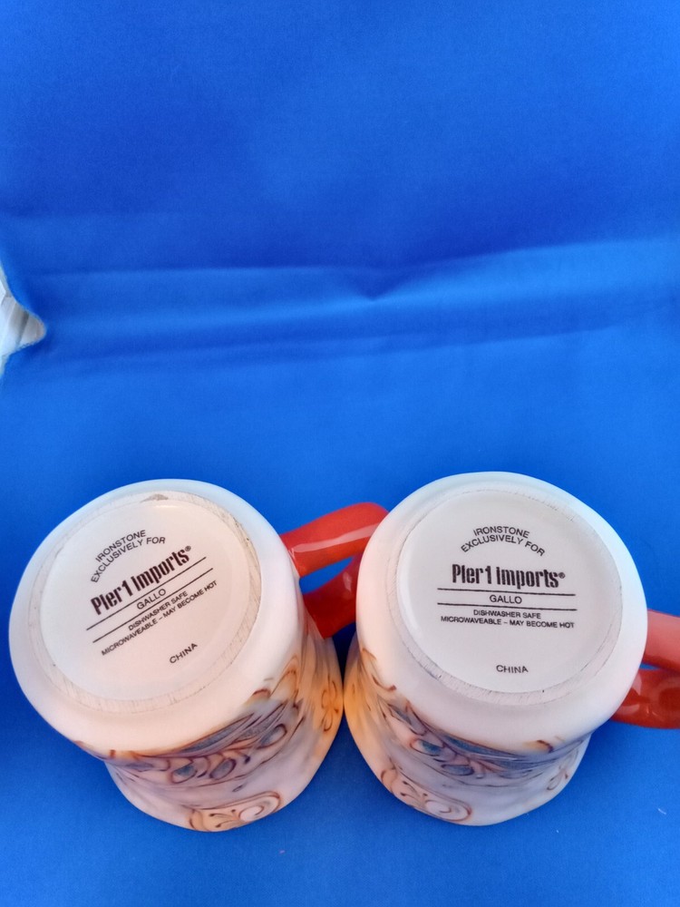 These beautiful mugs are off white ironstone with an orange rooster and abstract leaf designs. They have orange handles. They are 4 3/4'' tall, 3'' across the bottom flaring to 4'' across the top. There are no chips or cracks. They say Ironstone Exclusively for Pier 1 Imports Gallo Microwaveable, Dishwasher Safe. China on the bottom.