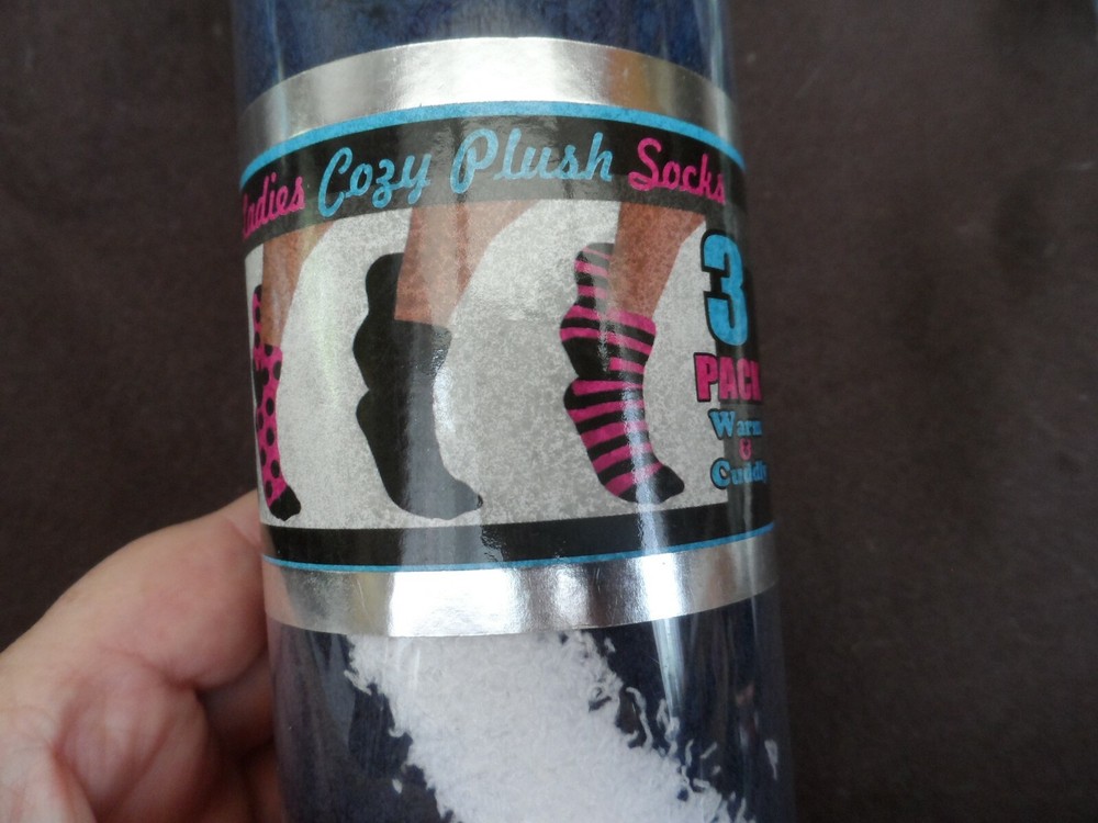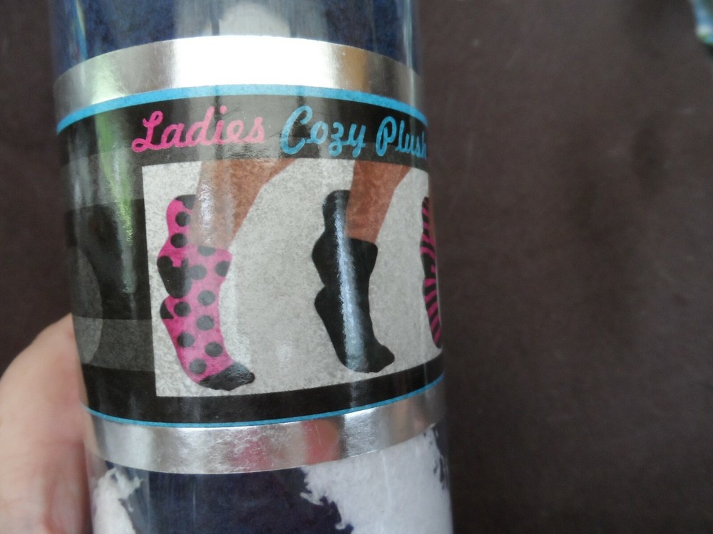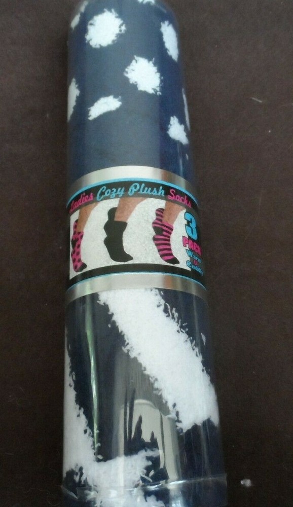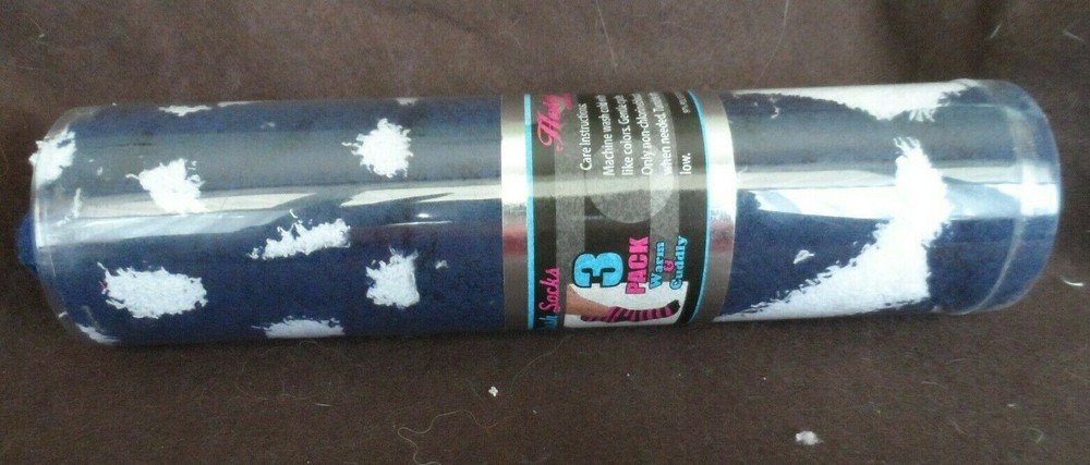 set of 3 Navy and white Ladies Cozy Plush socks Hotel Spa Collection size one fits most 3 pairs - one stripe, one spotted, one solid navy socks are perfect, the plastic tube container is missing the lid on one end. Socks have never been out of container smoke free home. I am always happy to combine shipping. INternational shipping is additional
