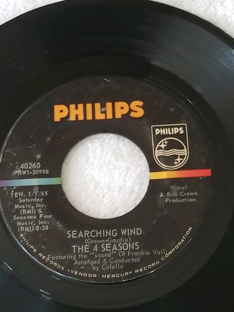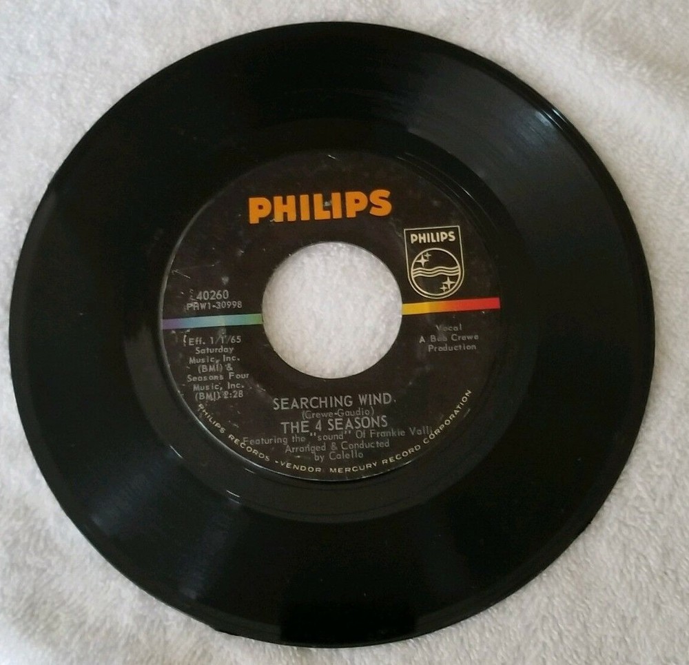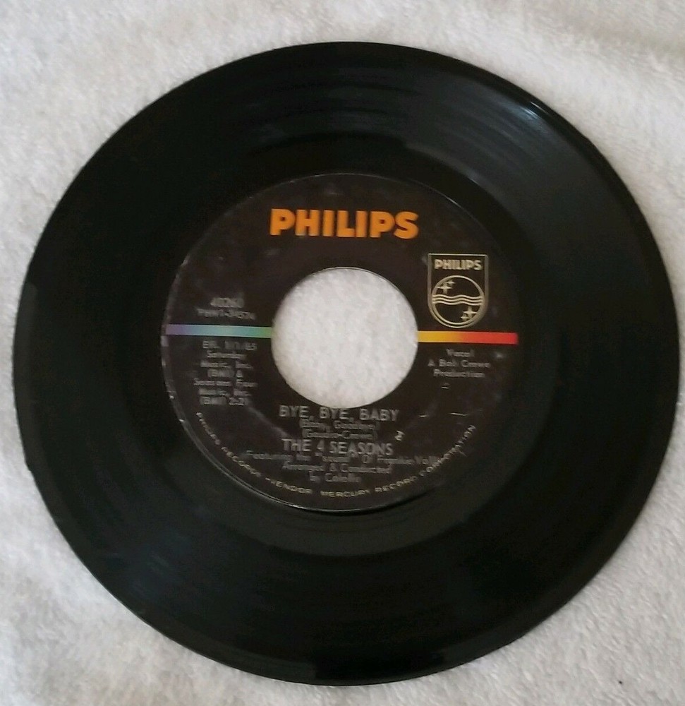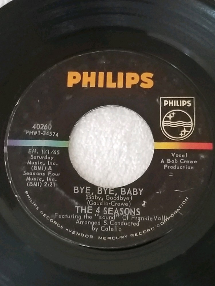 Vintage 45 RPM vinyl record (7 inches) original and authentic. Artist : The 4 Seasons featuring the "sound" of Frankie Valli Songs : Bye, Bye, Baby (Baby, Goodbye) / Searching Wind A Bye, Bye, Baby (Baby, Goodbye) Written-By – Gaudio-Crewe 2:21 B Searching Wind Written-By – Crewe-Gaudio 2:28 Music Label : Philips – 40260 Arranged By, Conductor – Calello Featuring [The Sound Of] – Frankie Valli Producer – Bob Crewe Year released : 1964 No record sleeve Please see photos to examine the record - the photos picture the actual item you will be receiving. Unsure of sound quality/playability of the record, as I do not have a record player to ascertain sound/playability From a smoke free and pet free home. Items usually ship out the next business day after payment.