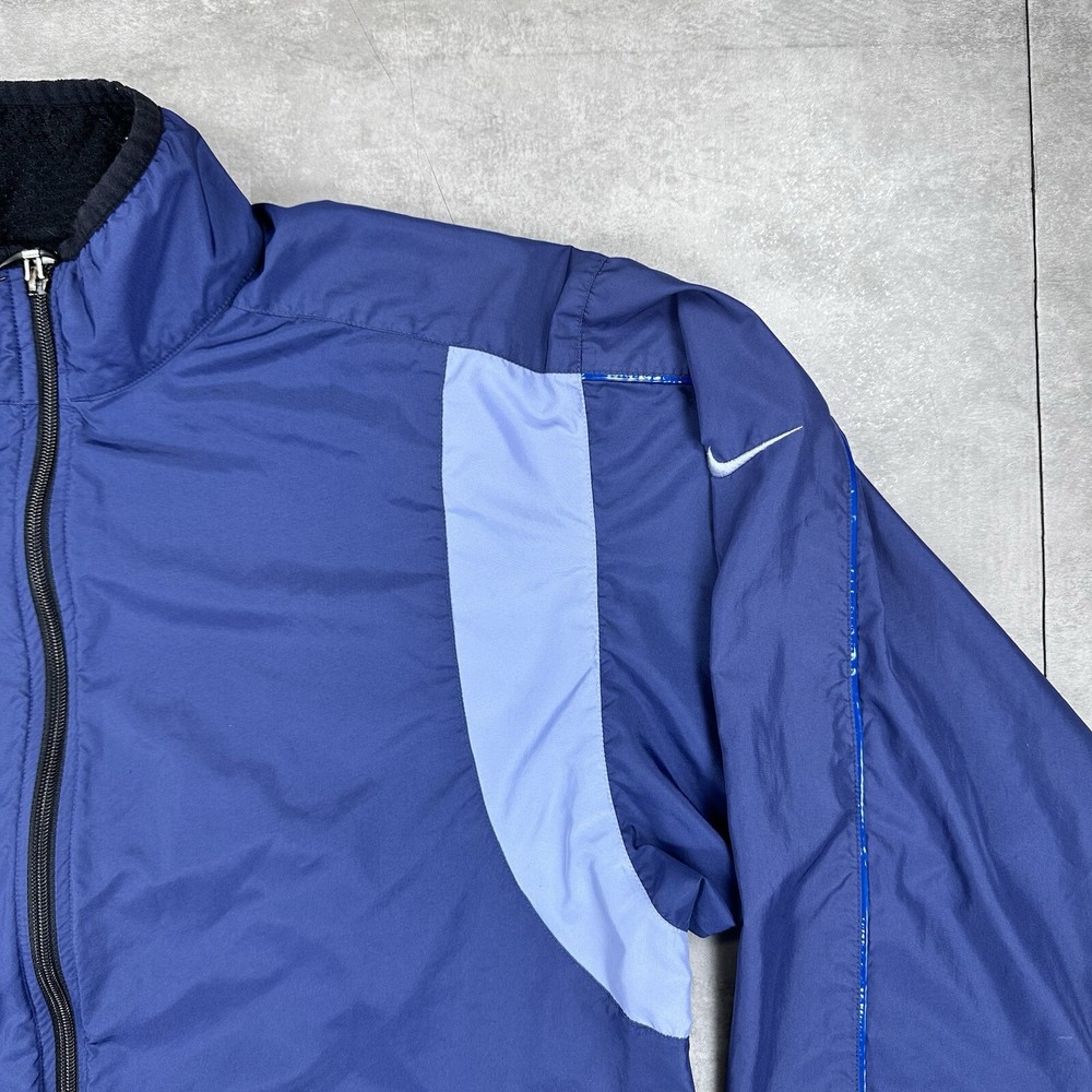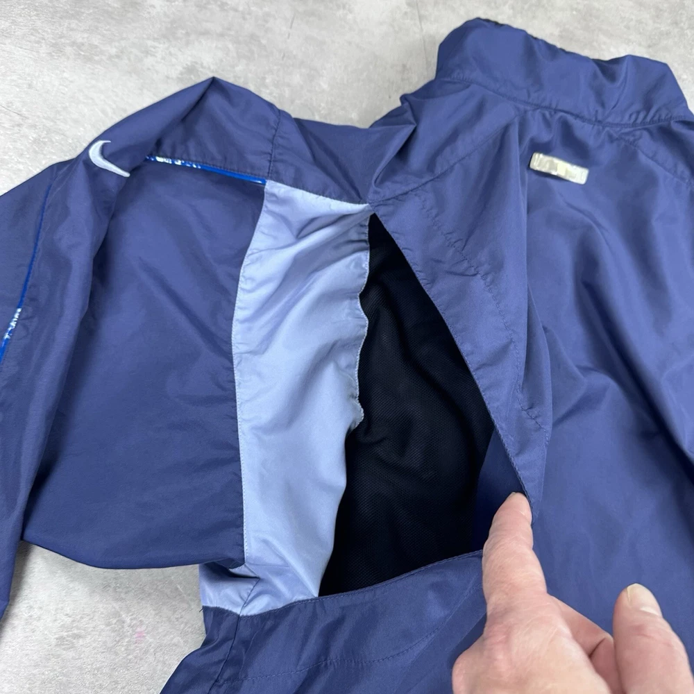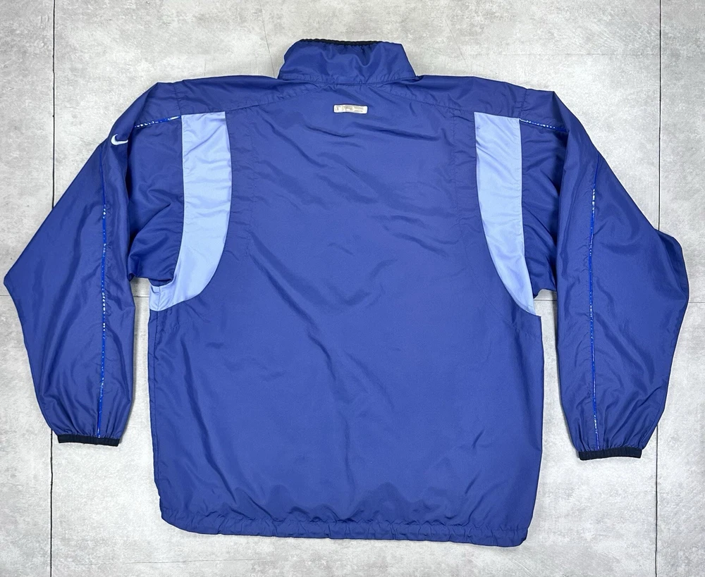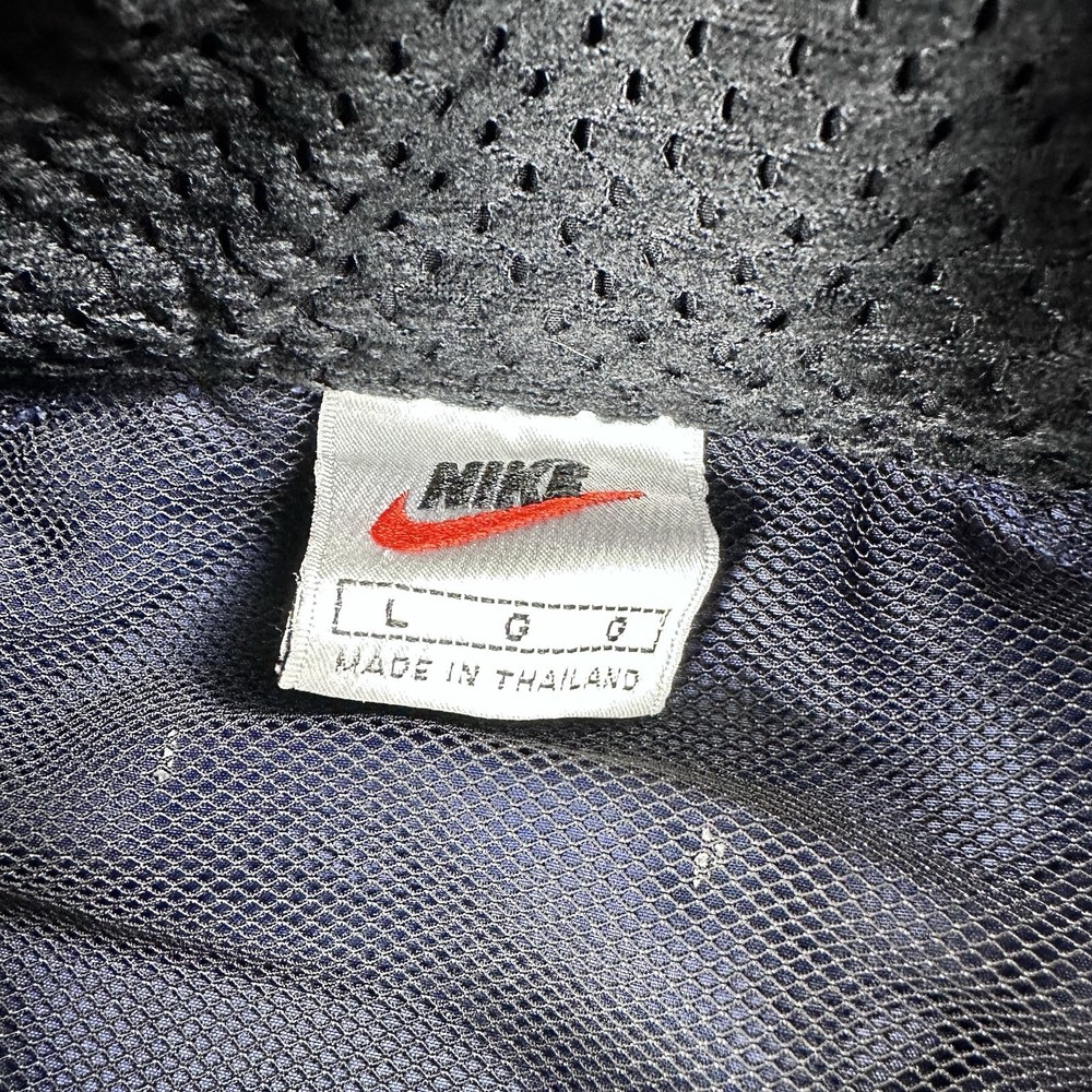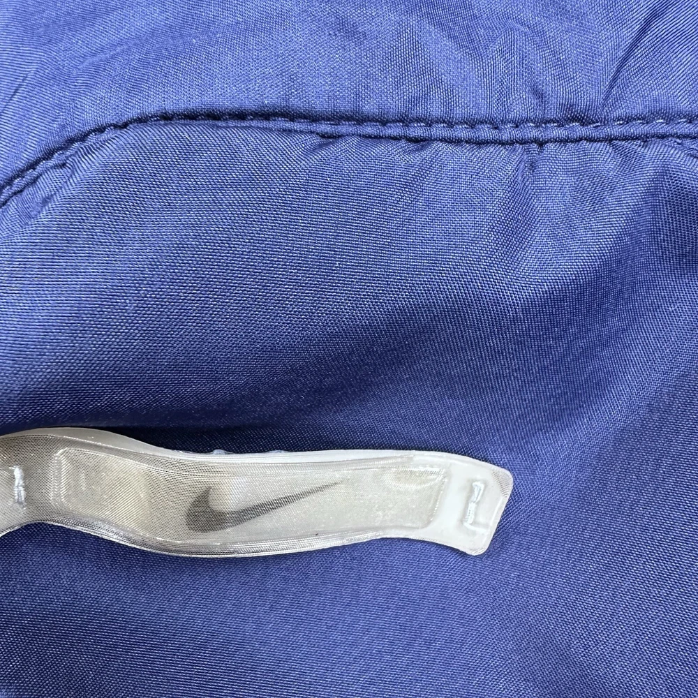 Elevate your athletic style with this vintage 90s Nike track jacket windbreaker. Made from softshell nylon fabric, this mid-length jacket features a full zip closure and drawstring waist for a comfortable fit. The geometric pattern in blue adds a touch of retro style, while the embroidered Nike logo on the chest showcases your sporty side. Ideal for travel, casual wear, or work, this wind-resistant jacket is perfect for all seasons. With multiple zipped pockets, you can easily carry your essentials for gym & training, track & field, walking, cross training, crossfit, running & jogging. This Nike product line is machine washable and comes in size L, making it a versatile addition to any wardrobe. Jacket is in good condition. Small flaw on front see pictures. 30 day returns accepted Same day shipping except weekends and holidays See pictures for measurements