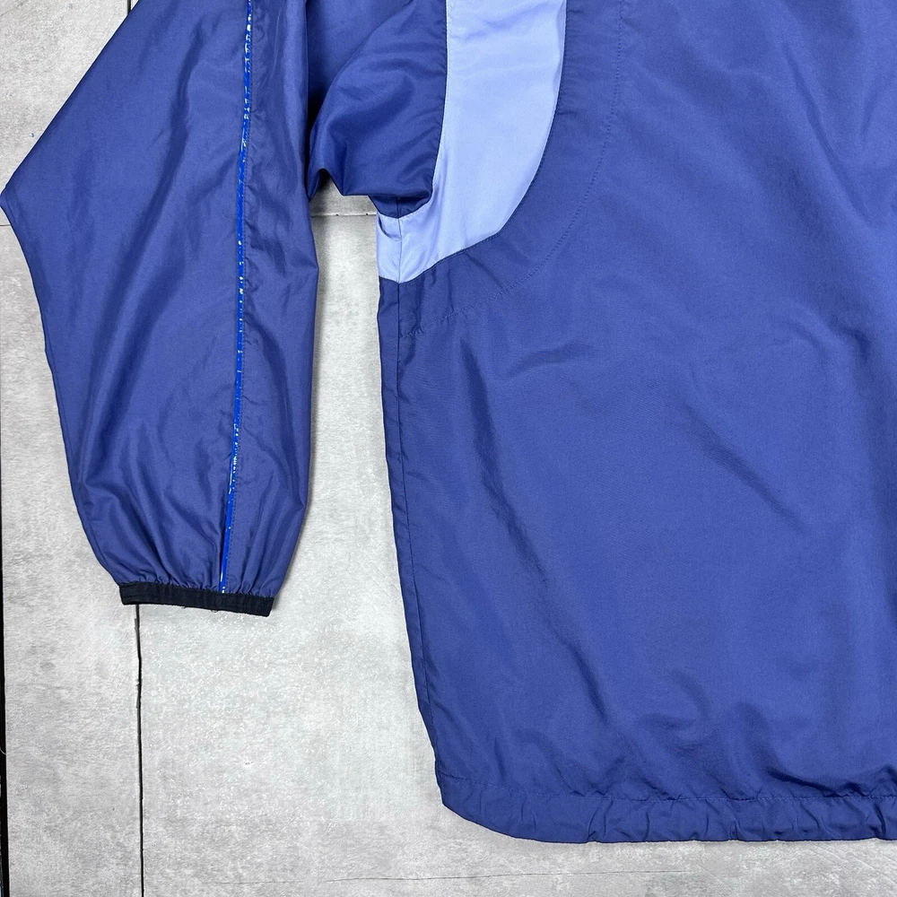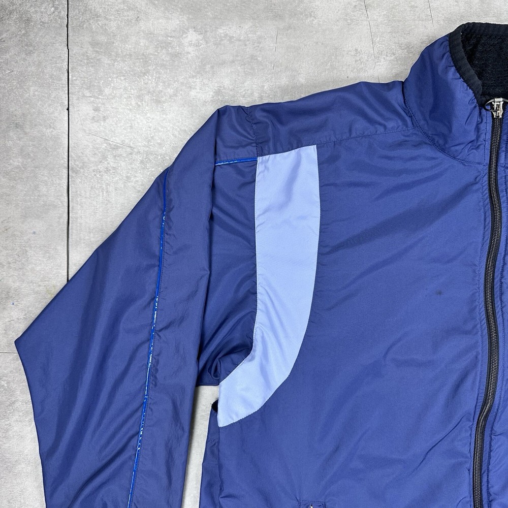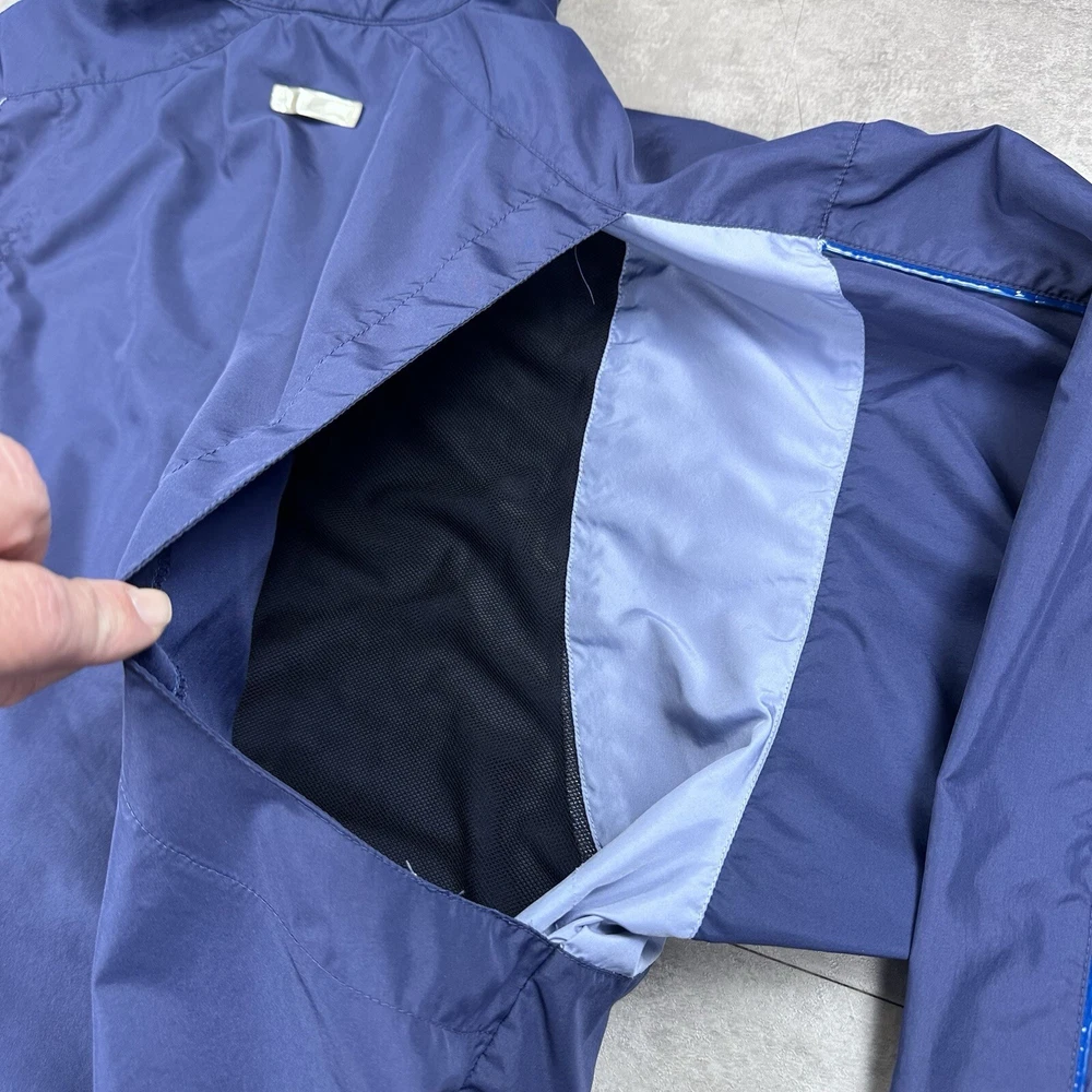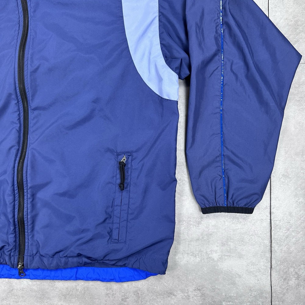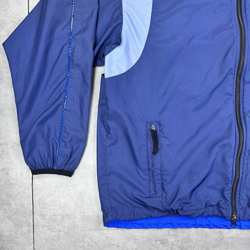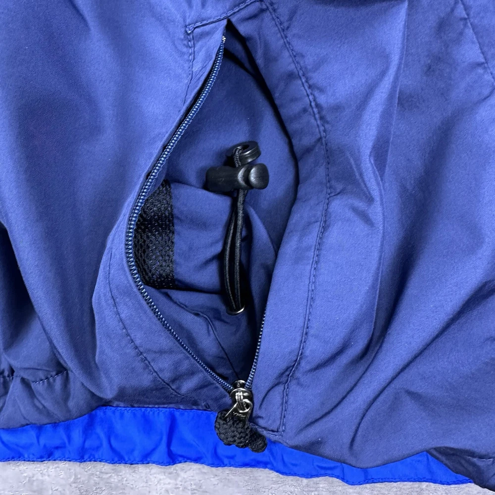 Elevate your athletic style with this vintage 90s Nike track jacket windbreaker. Made from softshell nylon fabric, this mid-length jacket features a full zip closure and drawstring waist for a comfortable fit. The geometric pattern in blue adds a touch of retro style, while the embroidered Nike logo on the chest showcases your sporty side. Ideal for travel, casual wear, or work, this wind-resistant jacket is perfect for all seasons. With multiple zipped pockets, you can easily carry your essentials for gym & training, track & field, walking, cross training, crossfit, running & jogging. This Nike product line is machine washable and comes in size L, making it a versatile addition to any wardrobe. Jacket is in good condition. Small flaw on front see pictures. 30 day returns accepted Same day shipping except weekends and holidays See pictures for measurements