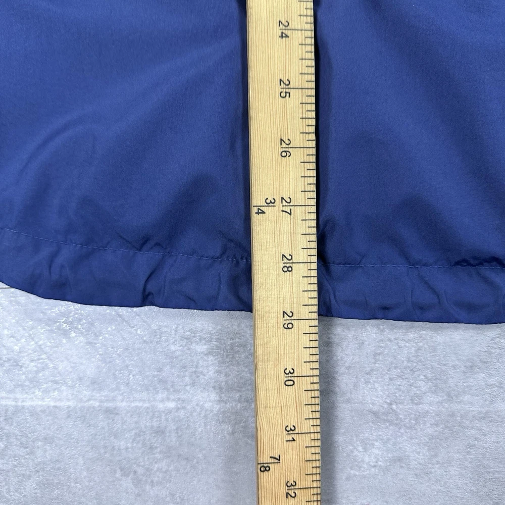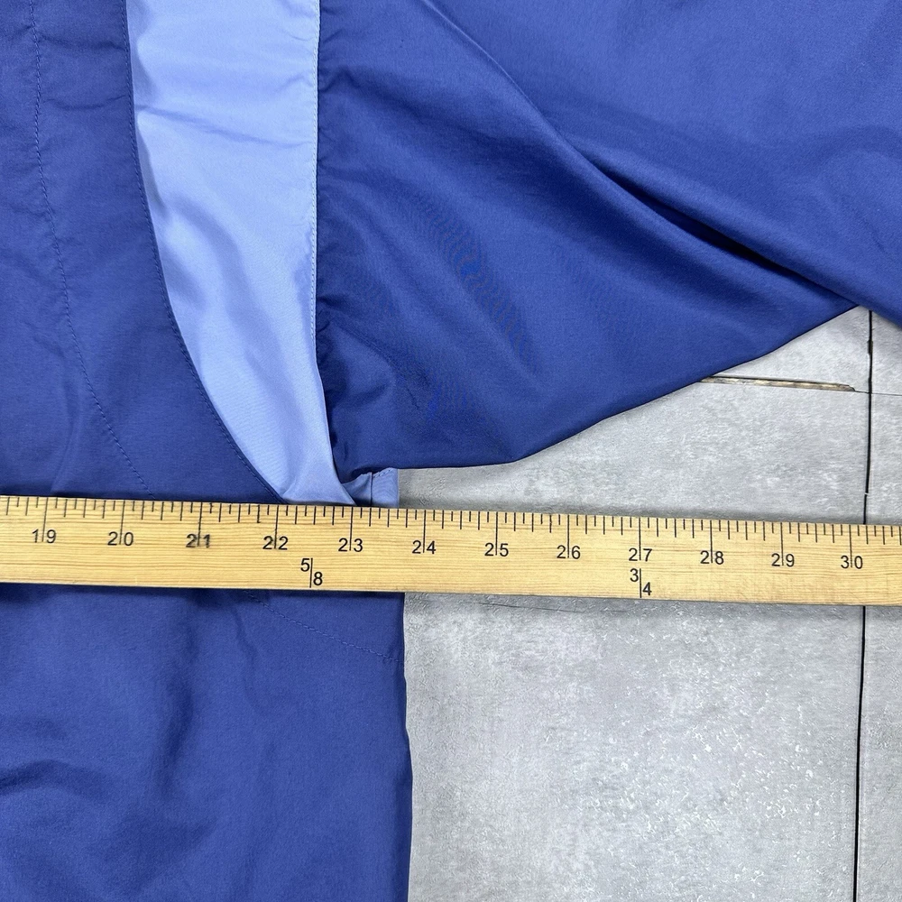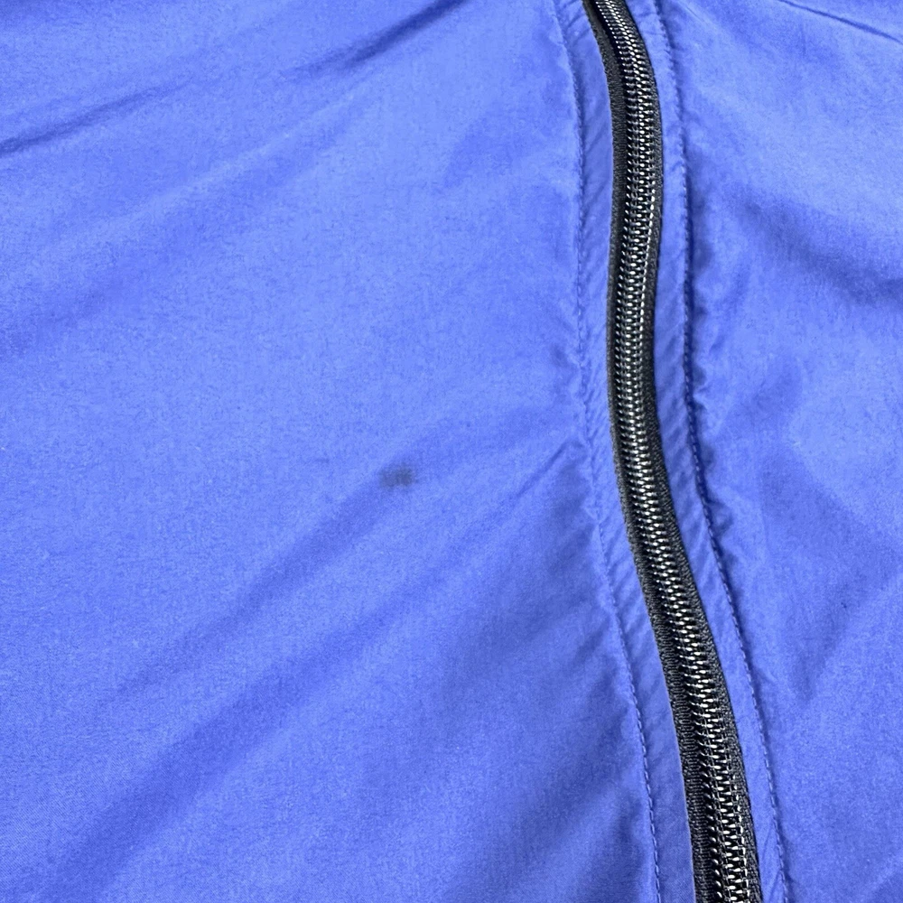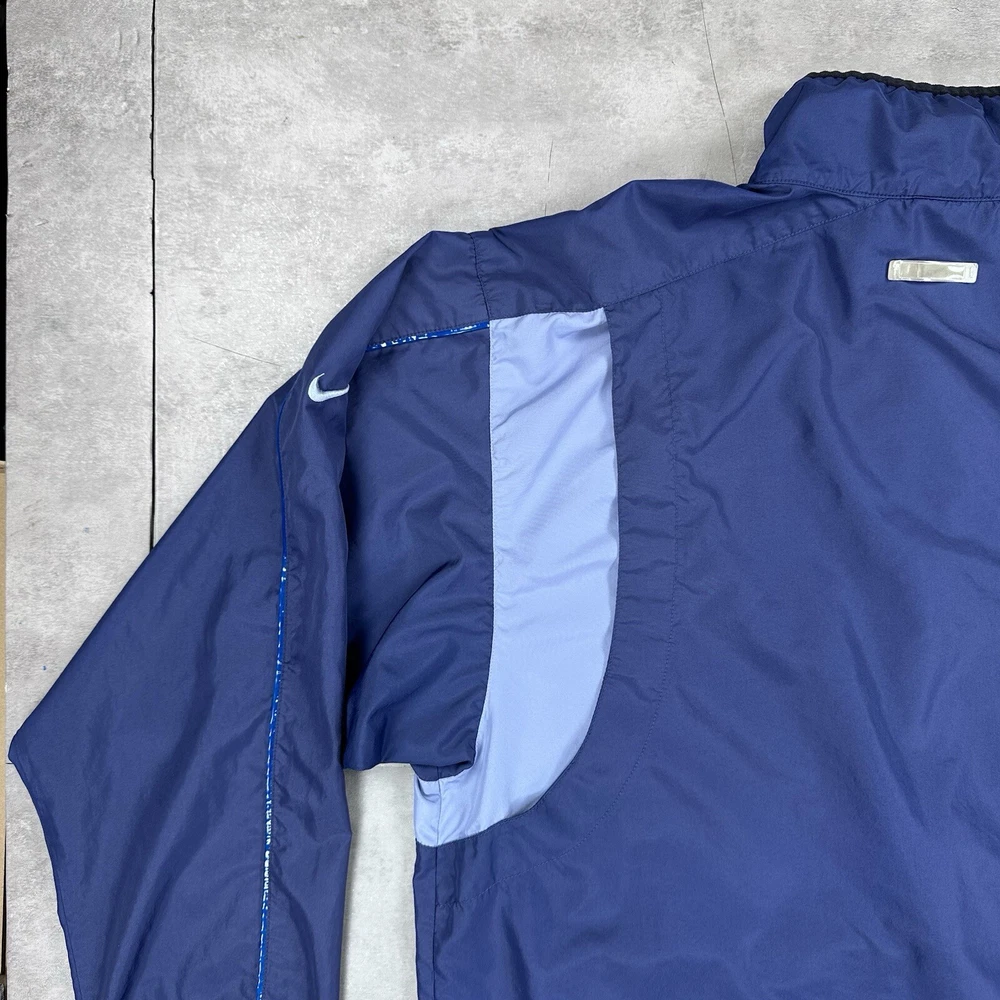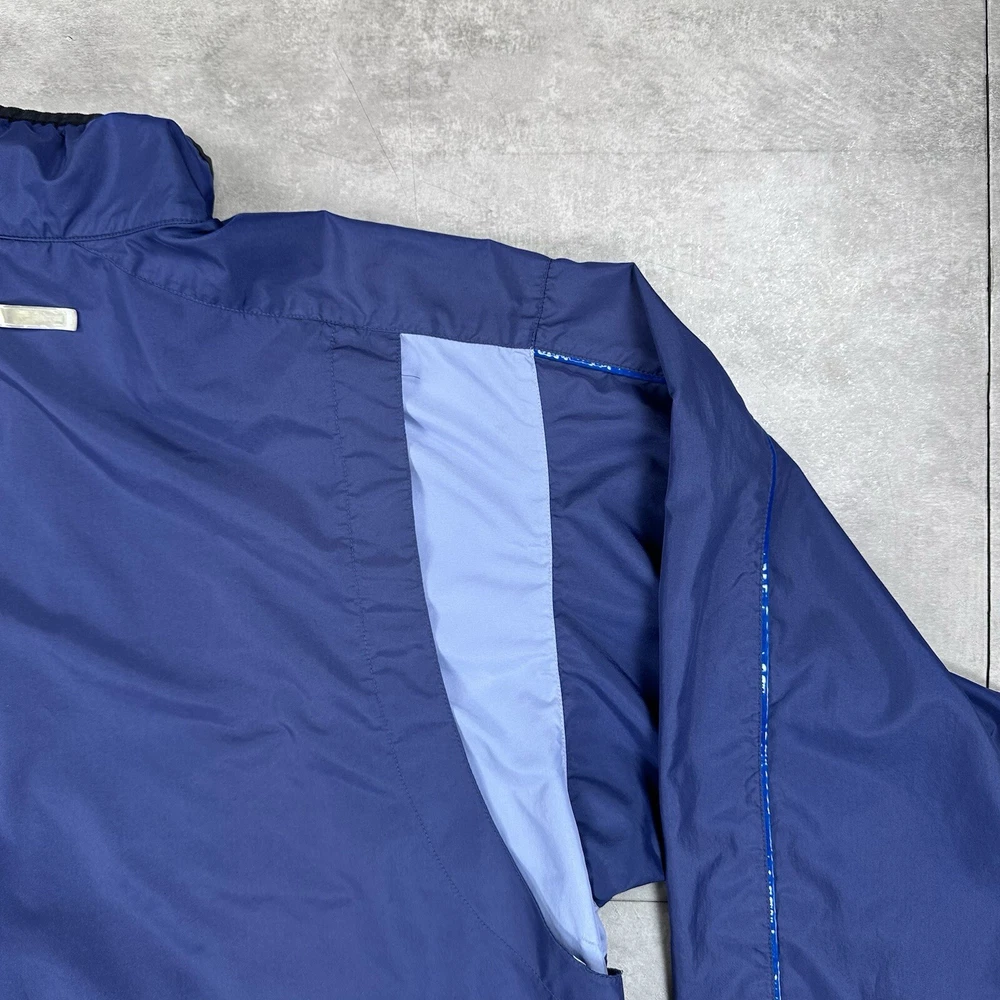 Elevate your athletic style with this vintage 90s Nike track jacket windbreaker. Made from softshell nylon fabric, this mid-length jacket features a full zip closure and drawstring waist for a comfortable fit. The geometric pattern in blue adds a touch of retro style, while the embroidered Nike logo on the chest showcases your sporty side. Ideal for travel, casual wear, or work, this wind-resistant jacket is perfect for all seasons. With multiple zipped pockets, you can easily carry your essentials for gym & training, track & field, walking, cross training, crossfit, running & jogging. This Nike product line is machine washable and comes in size L, making it a versatile addition to any wardrobe. Jacket is in good condition. Small flaw on front see pictures. 30 day returns accepted Same day shipping except weekends and holidays See pictures for measurements