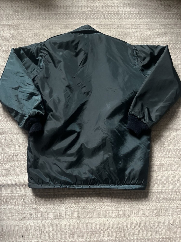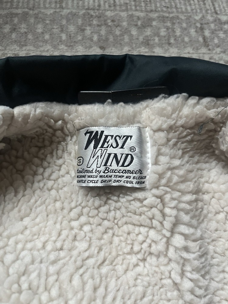 A vintage West Wind jacket in blue color, featuring a mid-length bomber style with a zip closure. This men's jacket is insulated with synthetic material, suitable for travel, casual wear, and work. It has a regular fit and is lined, wind-resistant, and equipped with pockets